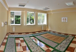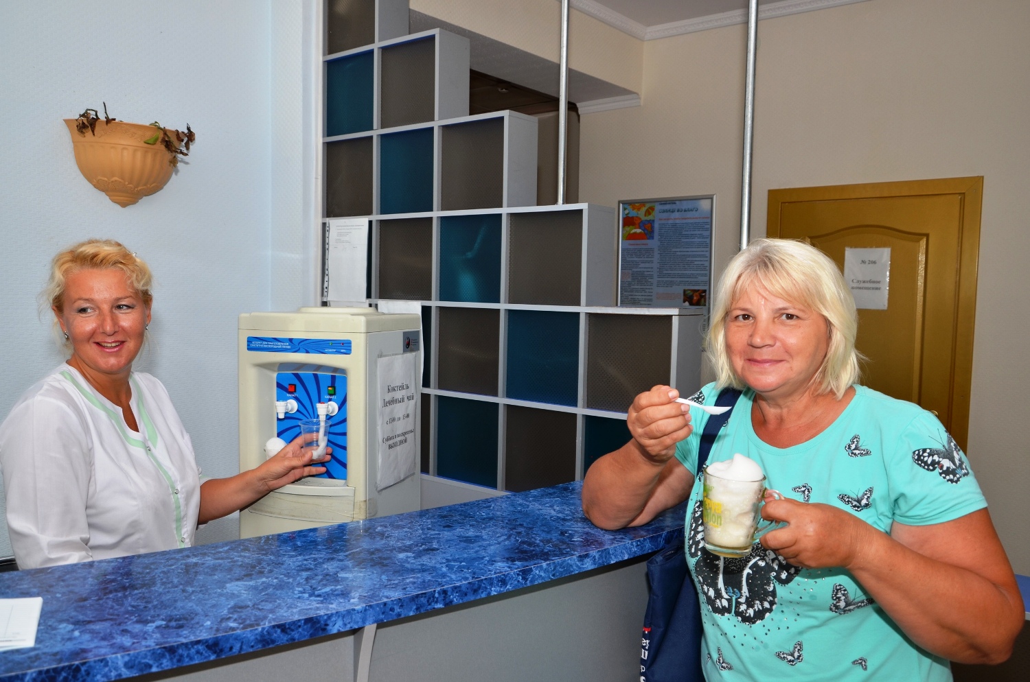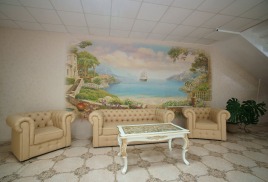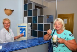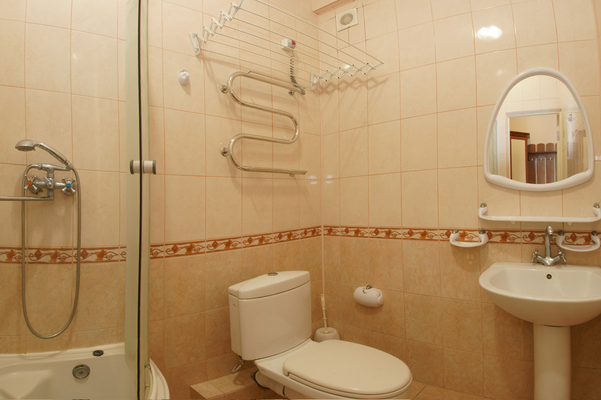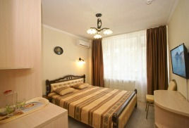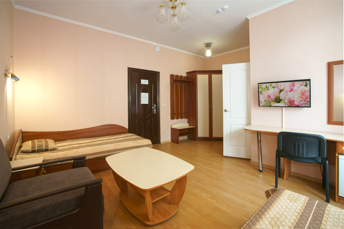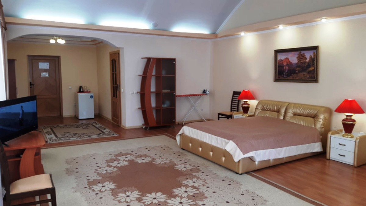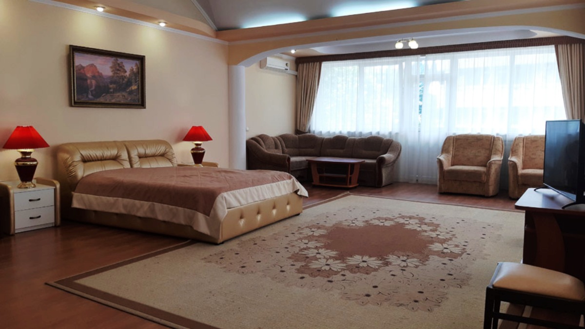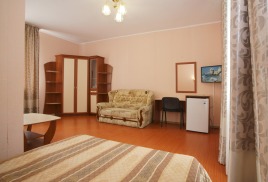 - 2-местный Люкс. Площадь - 50 м2. В номере: двуспальная кровать, диван, кондиционер, телевизор, спутниковое ТВ, холодильник, чайник, утюг, посуда, санузел с душем, балкон не во всех номерах. Номера расположены в двухэтажном корпусе (соединен теплым переход со столовой, с лечебным отделением и бассейном) и на 5м этаже лечебного корпуса.