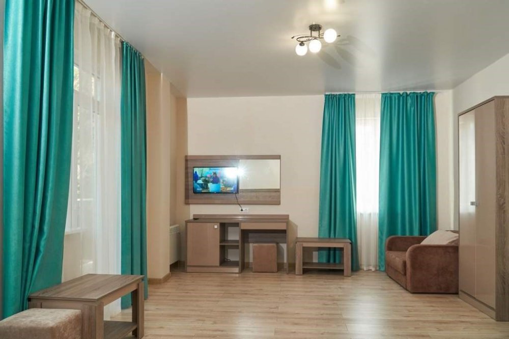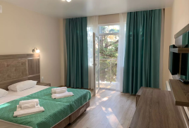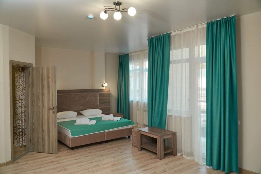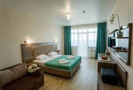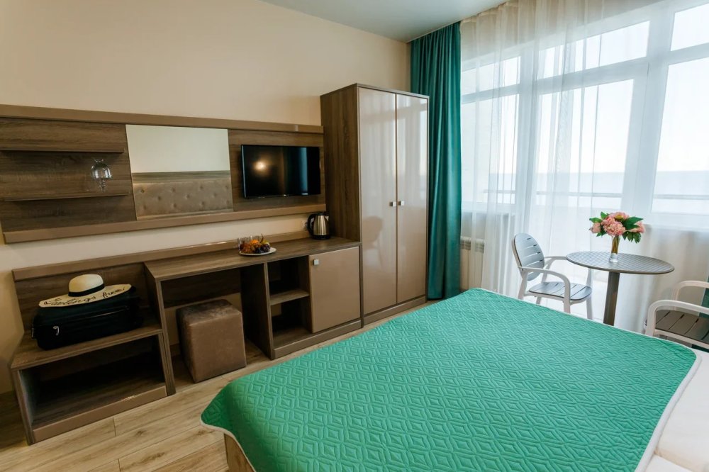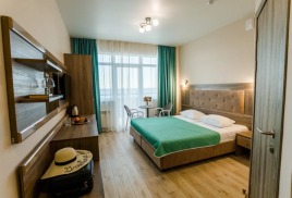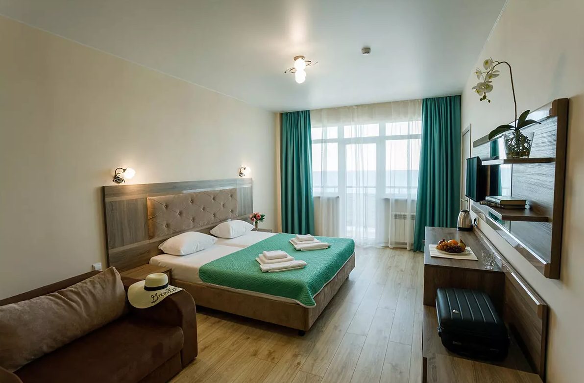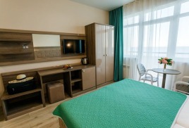 - 2-местный 2-комнатный Люкс. Площадь: 35-40 кв.м. В номере: спальня с двумя односпальными кроватями или одно двуспальной кроватью, гостиная с мягкой мебелью, кондиционер, телевизор, холодильник, чайник с набором посуды, сейф, санузел с душем, халат и тапочки. Балкон с видом на море.