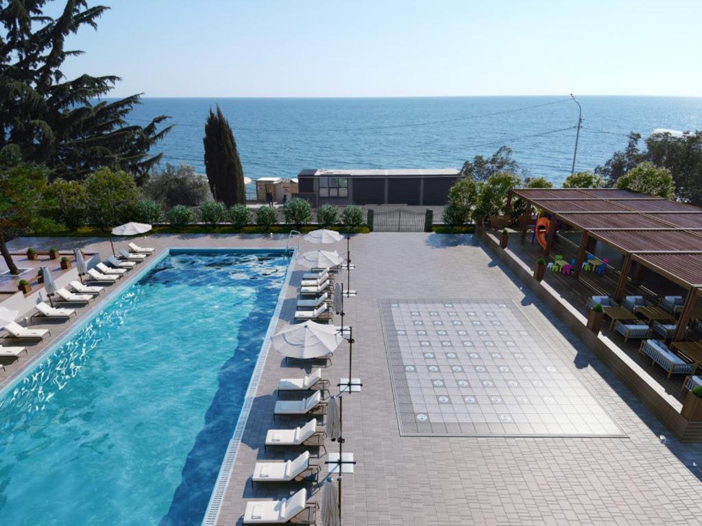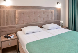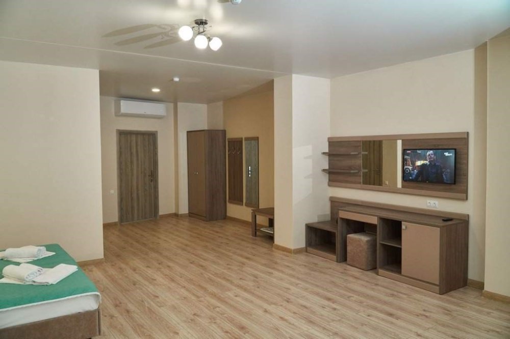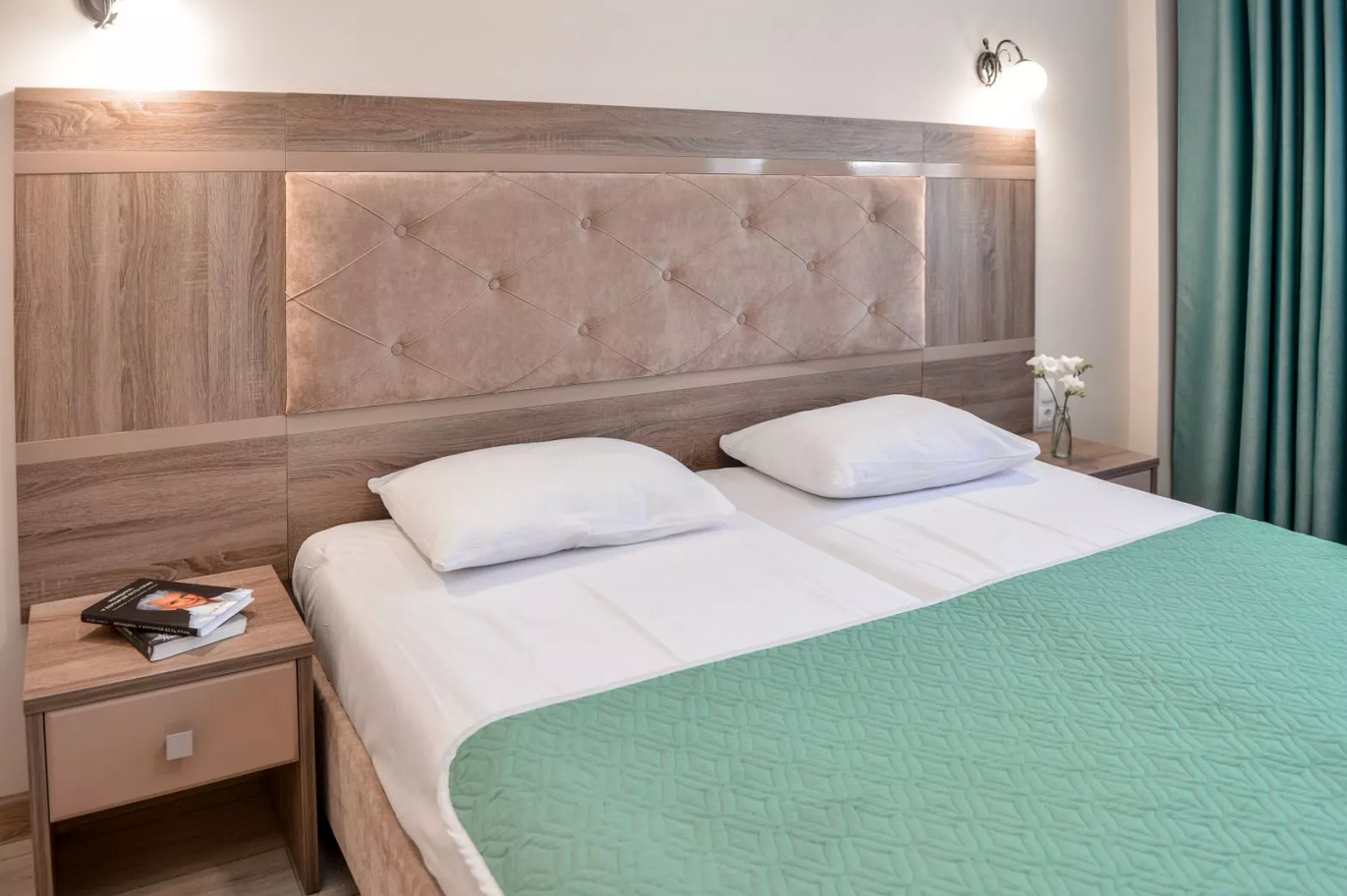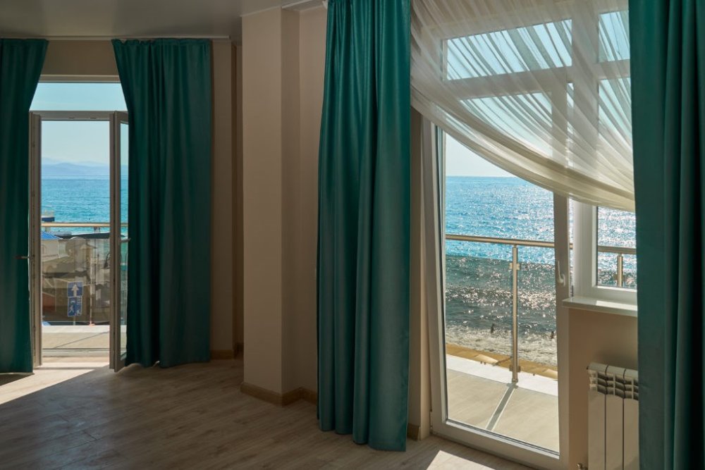 - 2-местный 2-комнатный Люкс. Площадь: 35-40 кв.м. В номере: спальня с двумя односпальными кроватями или одно двуспальной кроватью, гостиная с мягкой мебелью, кондиционер, телевизор, холодильник, чайник с набором посуды, сейф, санузел с душем, халат и тапочки. Балкон с видом на море.