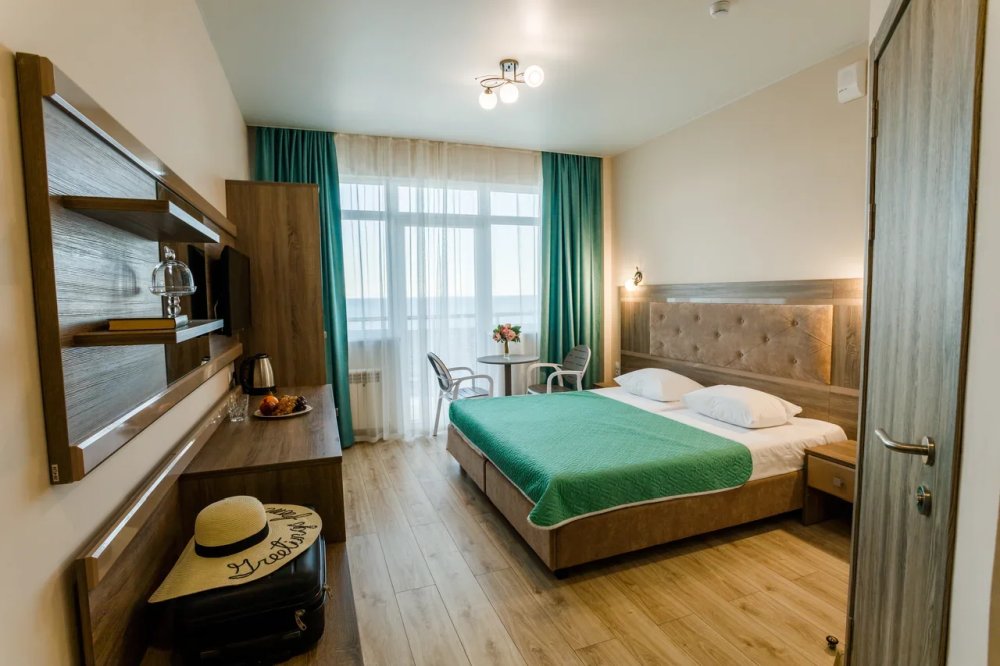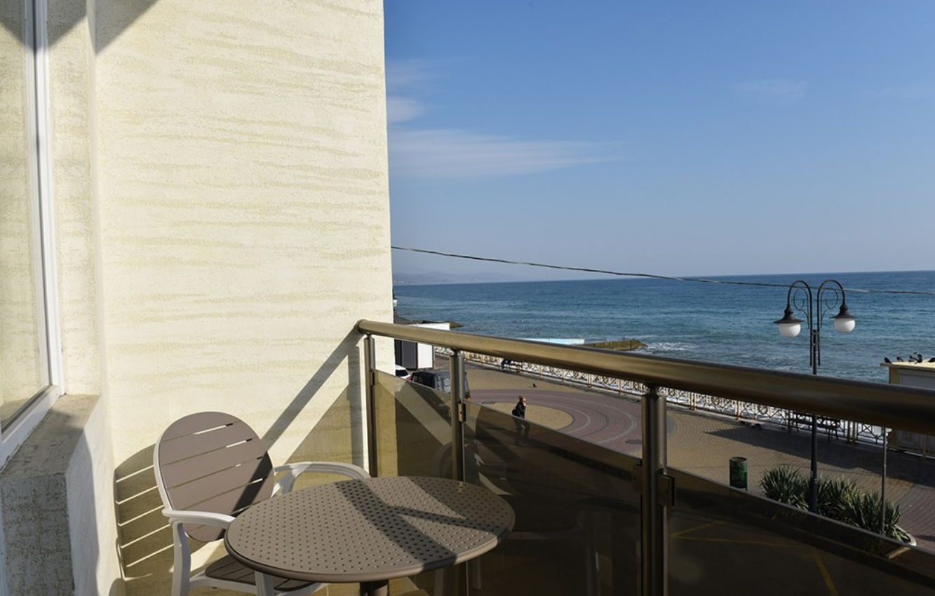 - 2-местный 1-комнатный Комфорт с видом на море. Площадь: 16-30 кв.м. В номере: две односпальные кровати или одна двуспальная кровать, кондиционер, телевизор, холодильник, чайник с набором посуды, сейф, санузел с душем. Номер с балконом и видом на море. Дополнительное место - еврораскладушка или диван.