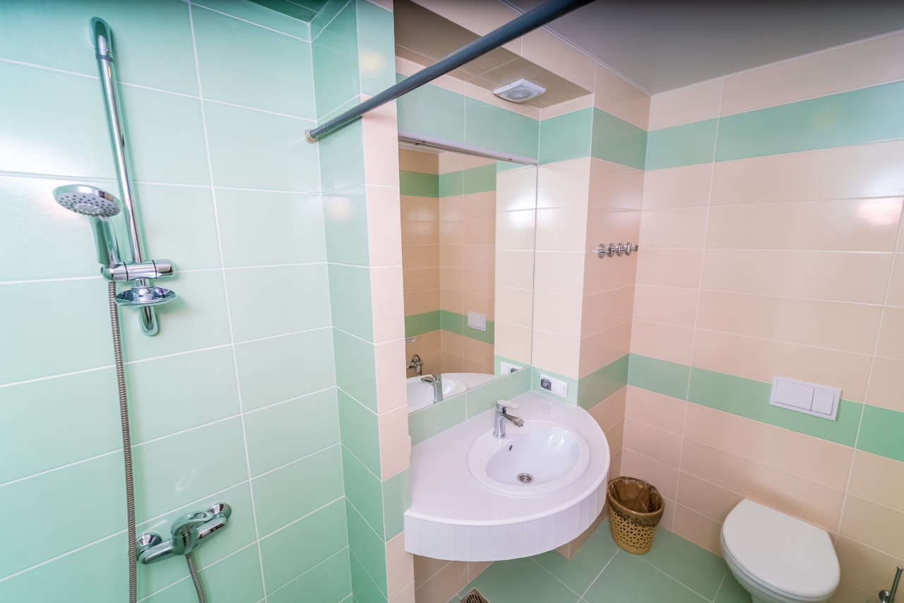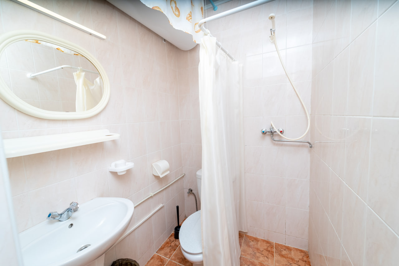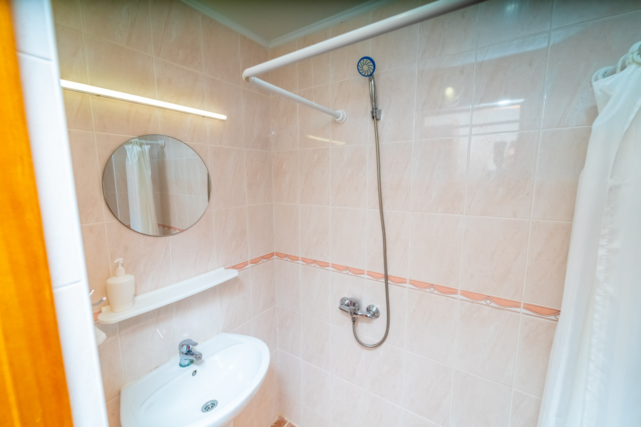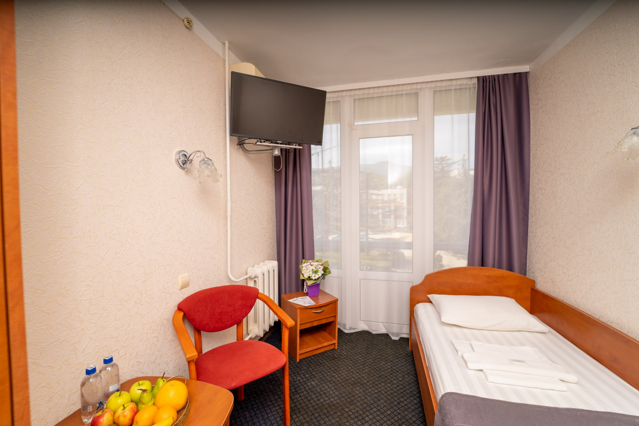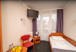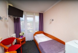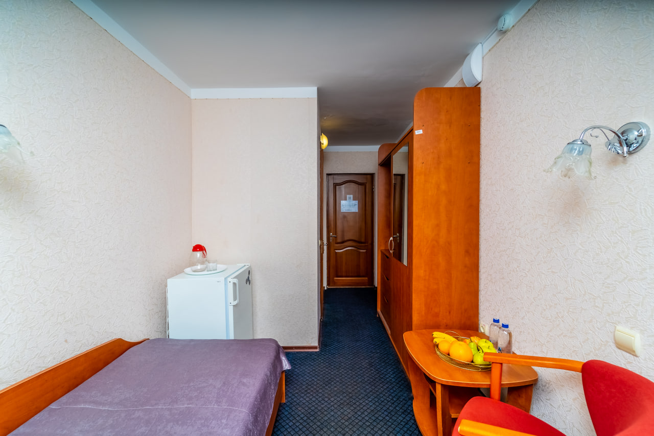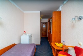 - 1-местный 1-комнатный Стандарт. Площадь 11-12 кв.м. В номере: односпальная кровать, телевизор, холодильник, кондиционер, душ, туалет. Номер без балкона. Доп. место не устанавливается.