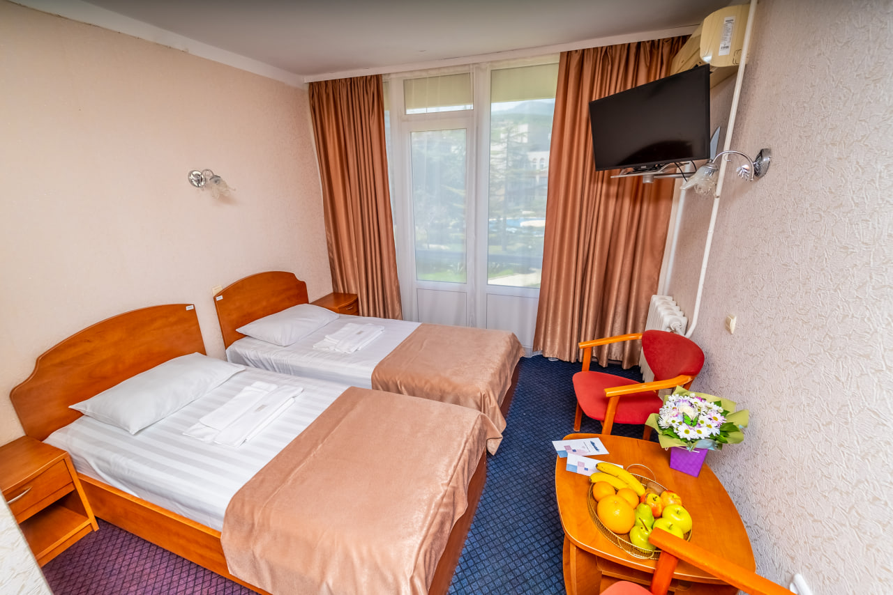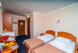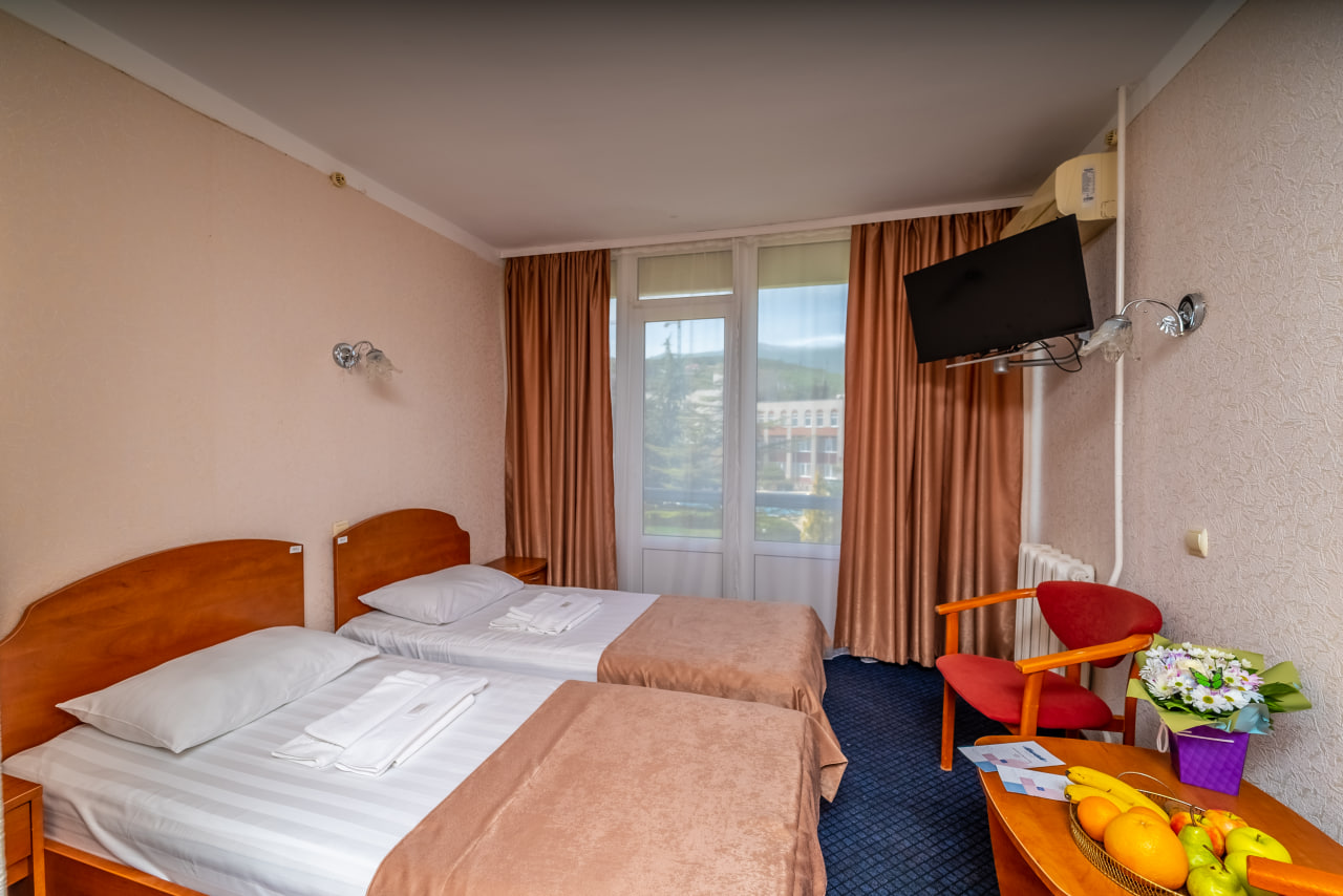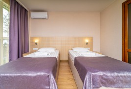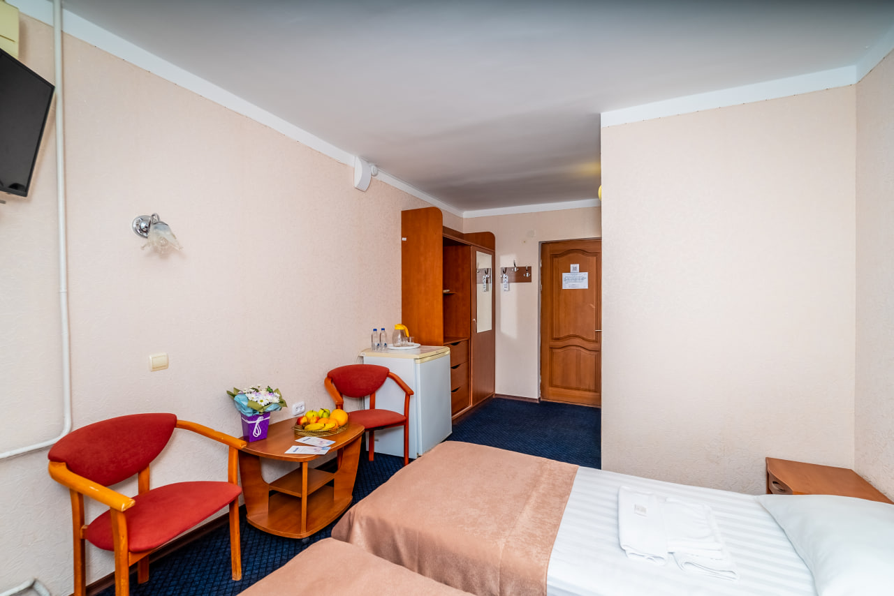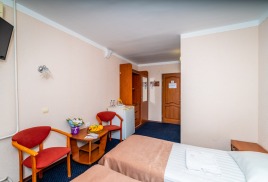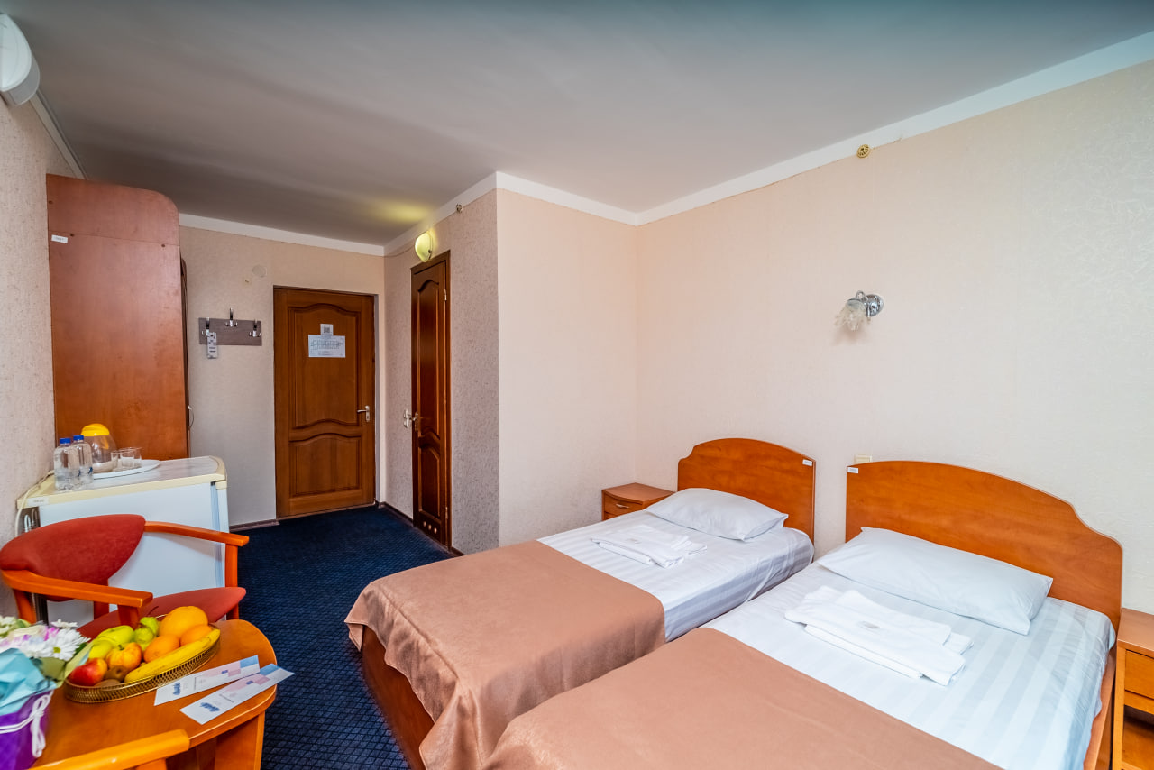 - 2-местный 1-комнатный Стандарт. Площадь 12-16 кв.м. В номере: две односпальные кровати, телевизор, холодильник, кондиционер, душ, туалет. Номер без балкона. Доп. место не устанавливается.