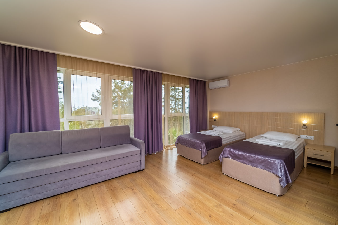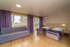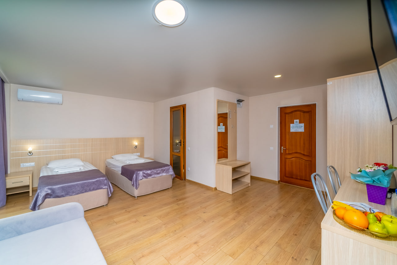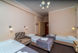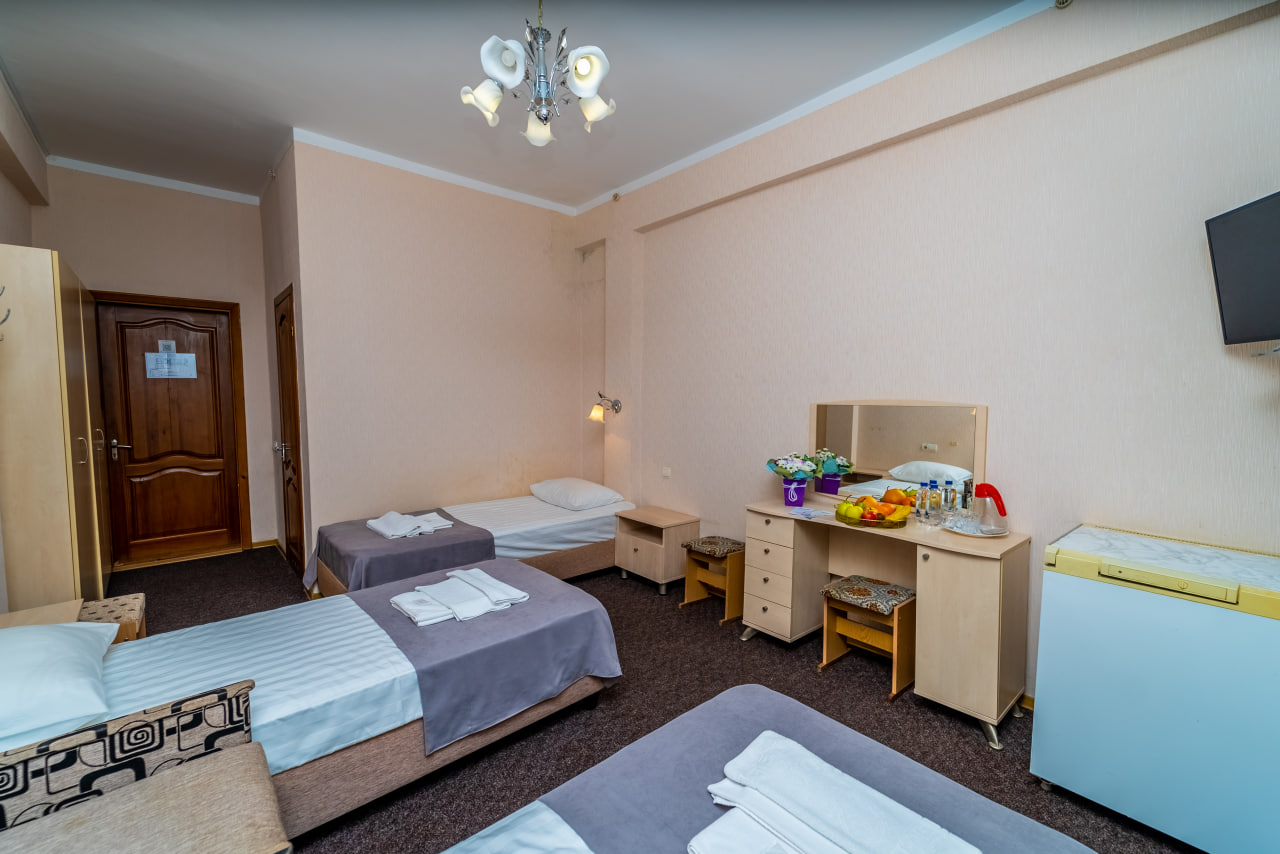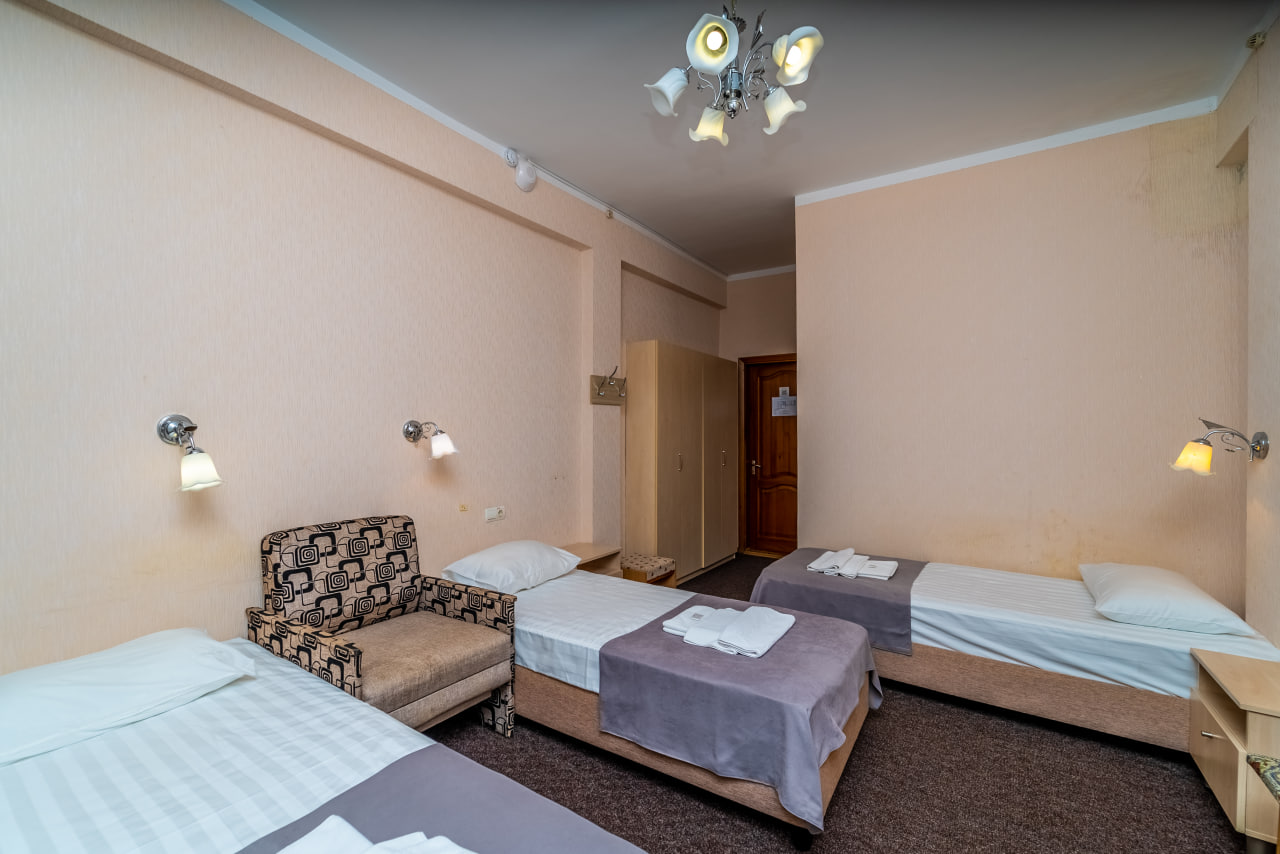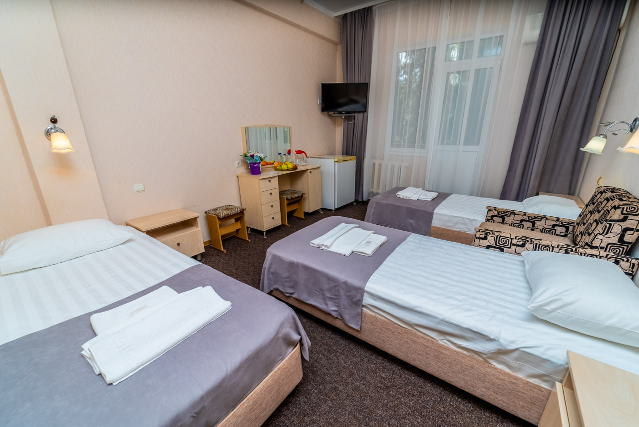 - 3-местный 1-комнатный Стандарт. Площадь 16-21 кв.м. В номере: три раздельные односпальные кровати, телевизор, холодильник, кондиционер, душ, туалет. Номер с балконом. Доп. место не устанавливается.