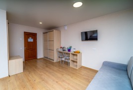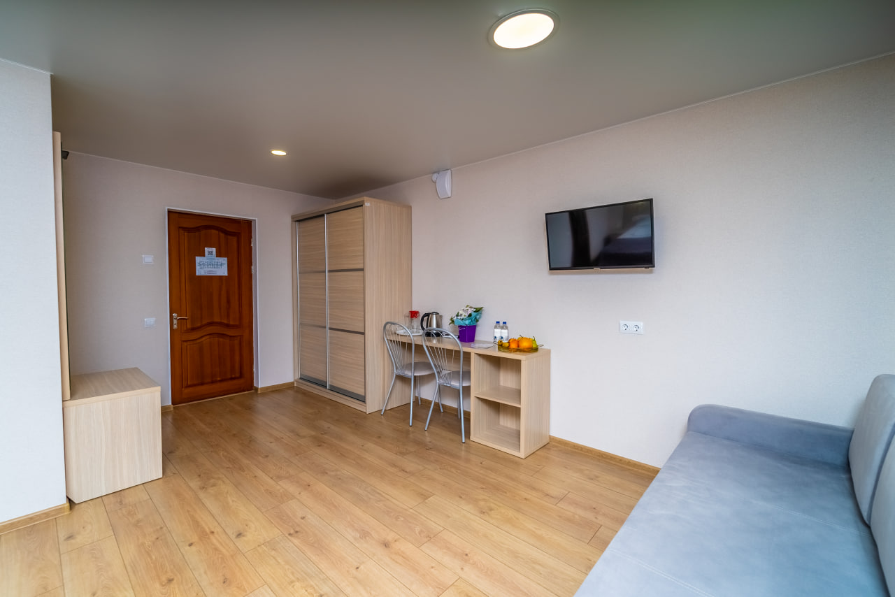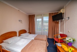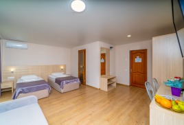 - 2-местный 1-комнатный Улучшенный. Площадь 27 кв.м. В номере: две односпальные кровати, диван, телевизор, холодильник, кондиционер, душ, туалет. Номер без балкона Доп. место - 2 человек.