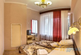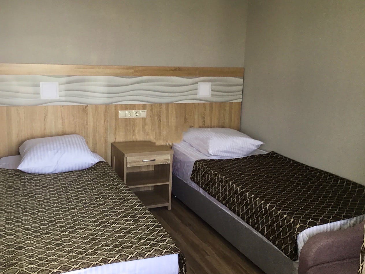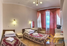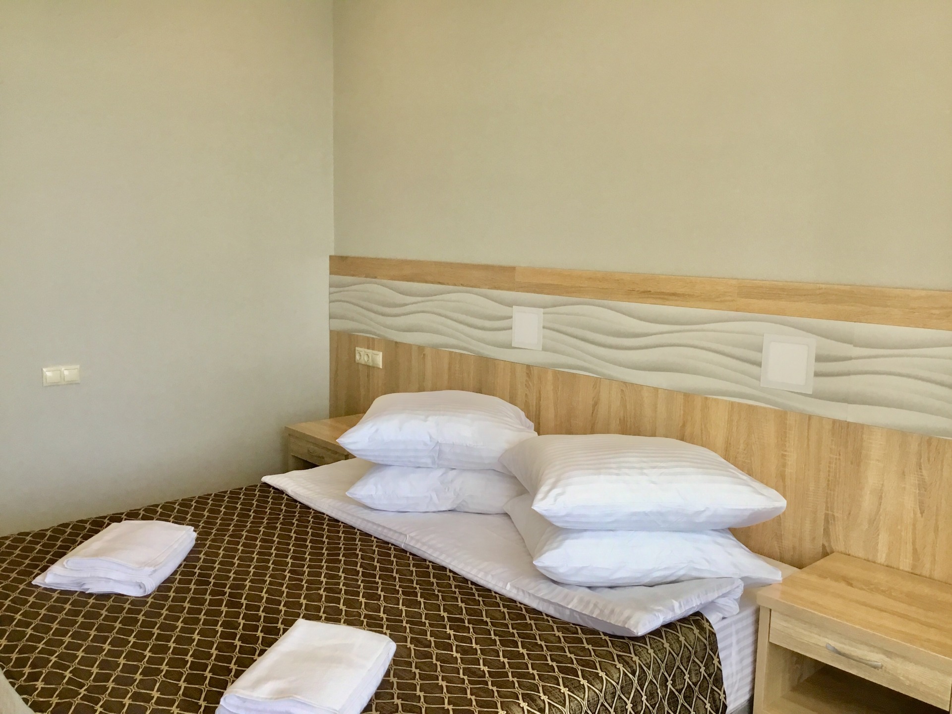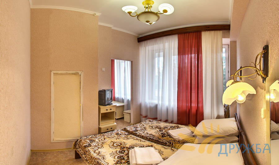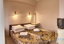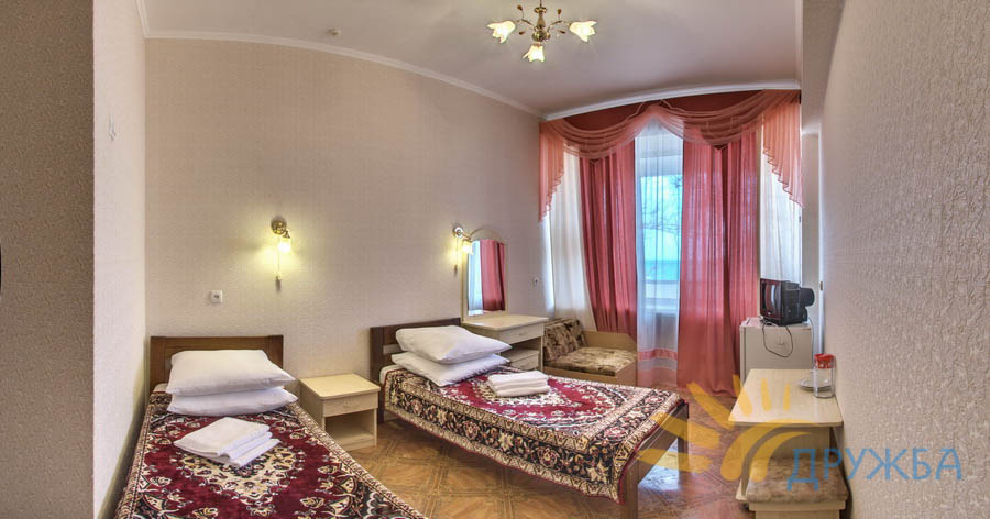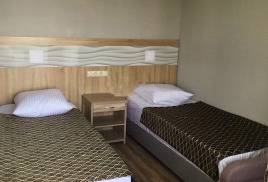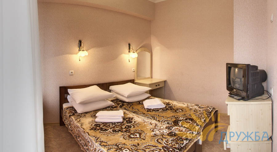- 2-местный 1-комнатный стандарт. Корпус № 5, 6, 7. Площадь: 15 кв. м. В номере: две односпальные кровати, телевизор, холодильник, санузел с душем, балконом. Дополнительное место устанавливается только для ребенка до 13 лет (вкл.).
