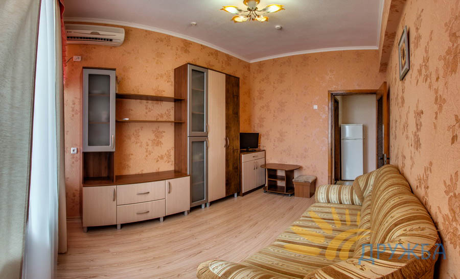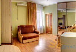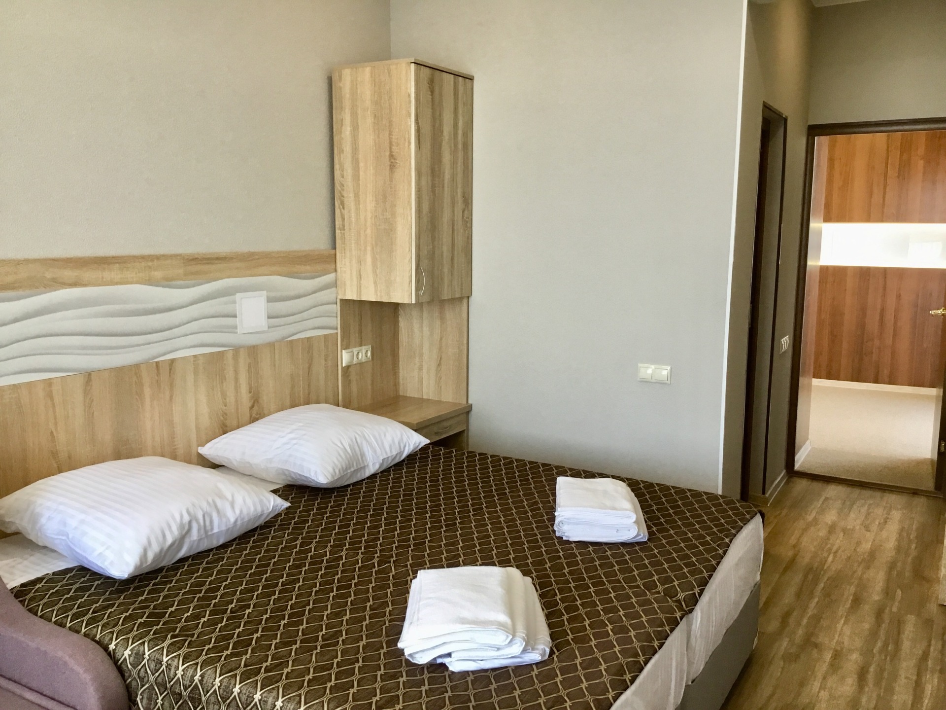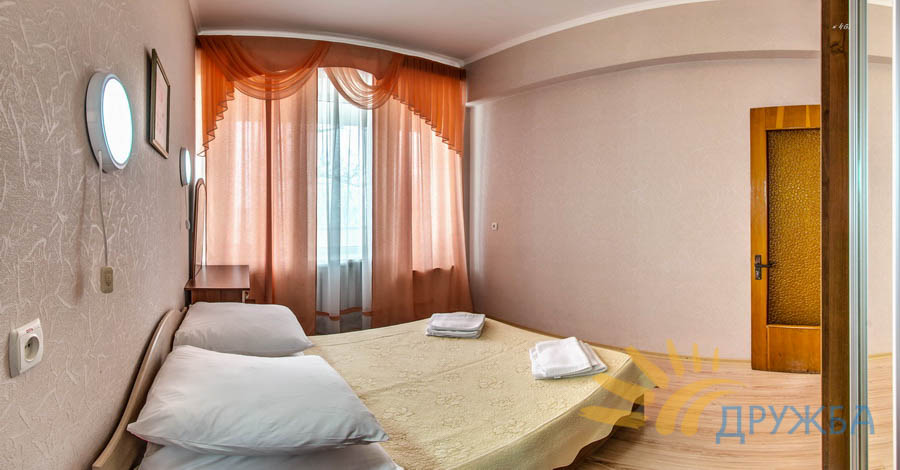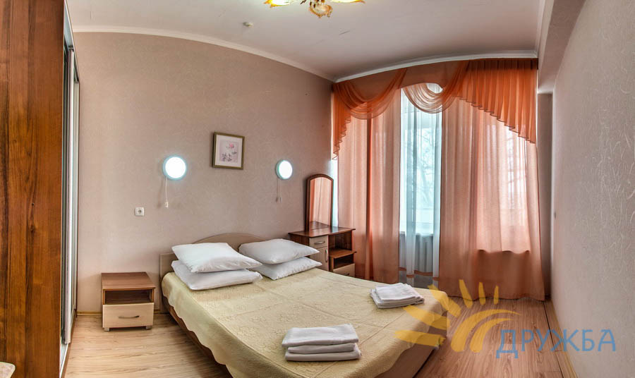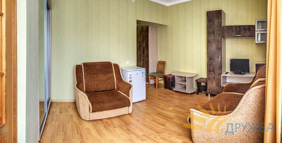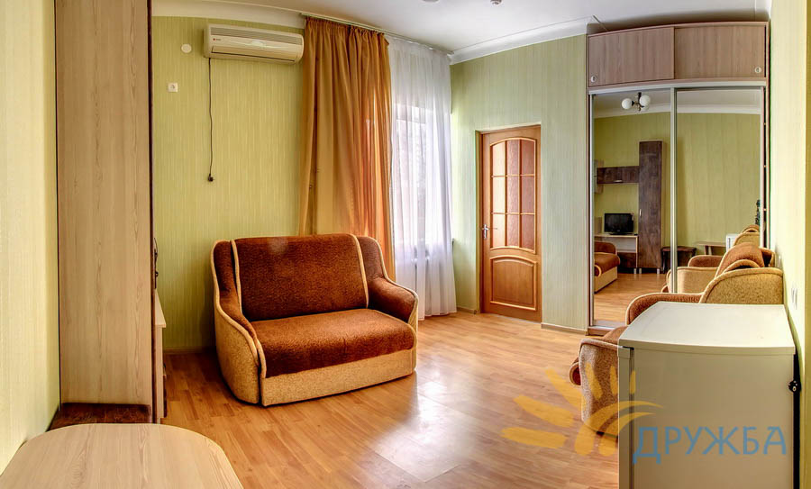 - 2-местный 2-комнатный люкс юг комфорт с кондиционером. Корпус № 7 (7, 8, 9 этаж). Площадь: 24 - 26 кв. м. В номере: спальня с двуспальной кроватью, гостинная с мягкой мебелью, сейф, холодильник, телевизор, кондиционер, санузел с душем, балкон