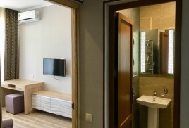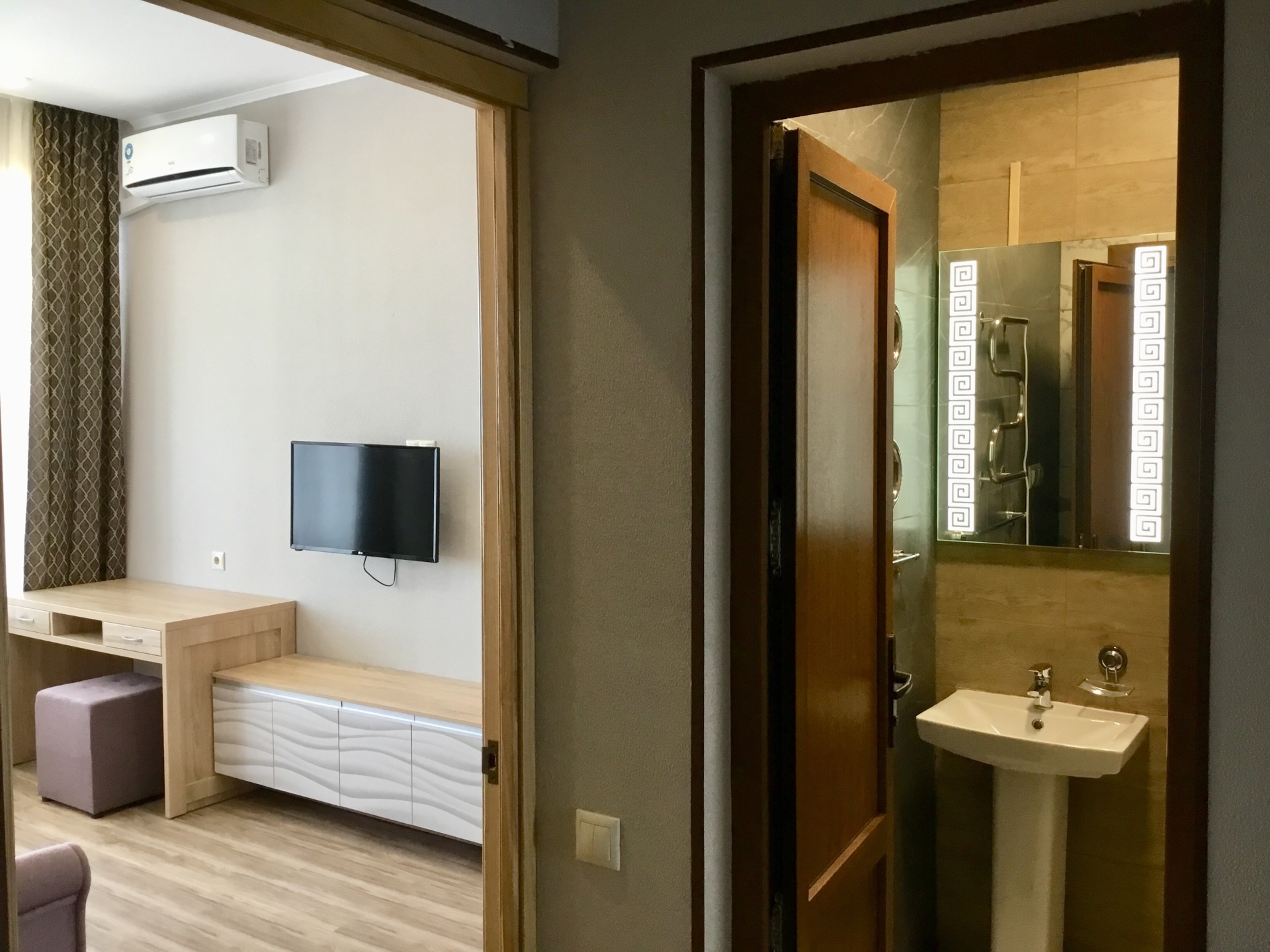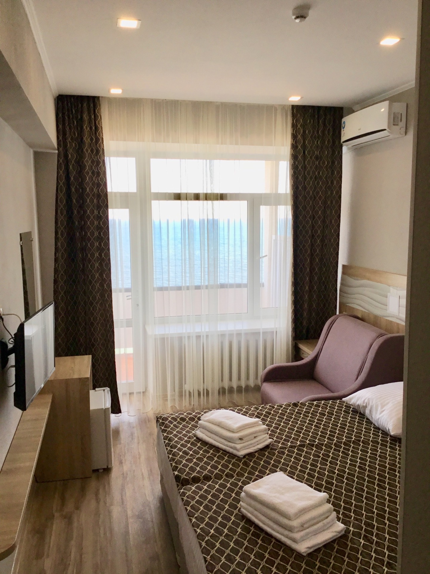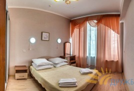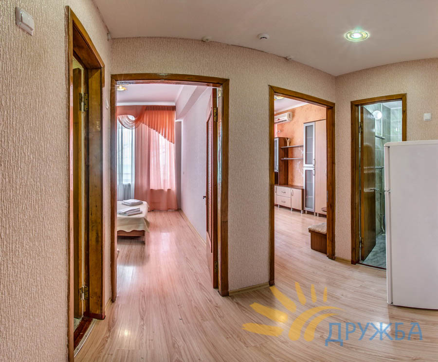 - 2-местный 2-комнатный люкс юг комфорт с кондиционером. Корпус № 7 (7, 8, 9 этаж). Площадь: 24 - 26 кв. м. В номере: спальня с двуспальной кроватью, гостинная с мягкой мебелью, сейф, холодильник, телевизор, кондиционер, санузел с душем, балкон