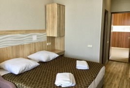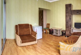 - 2-местный 2-комнатный люкс. Корпус № 5, 6, 7. Площадь: 26 кв. м. В номере: спальня с двумя односпальными или двуспальной кроватью, гостиная с мягкой мебелью, холодильник, телевизор, кондиционер, санузел с душем, балкон. Дополнительное место - диван.