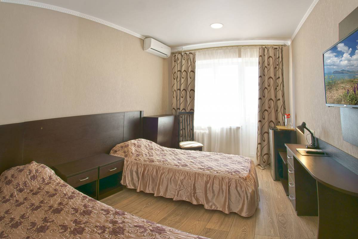 - 2-местный 1-комнатный стандарт север/юг. Площадь – 14 кв.м.В номере: две односпальные кровати, телевизор, кондиционер, холодильник, санузел, лоджия с видом на море или город.