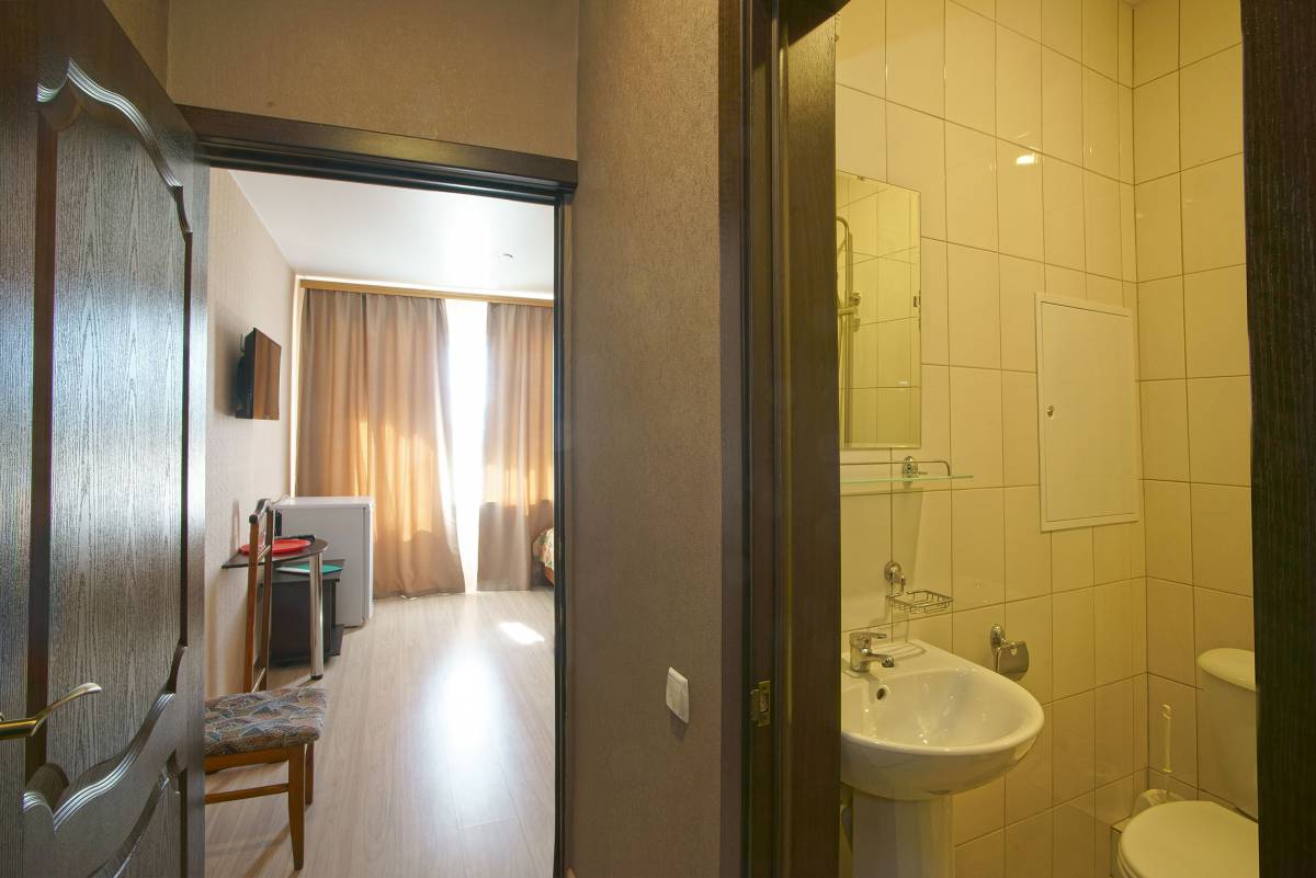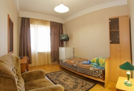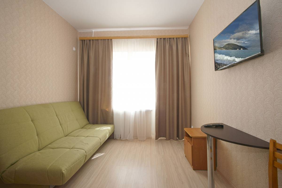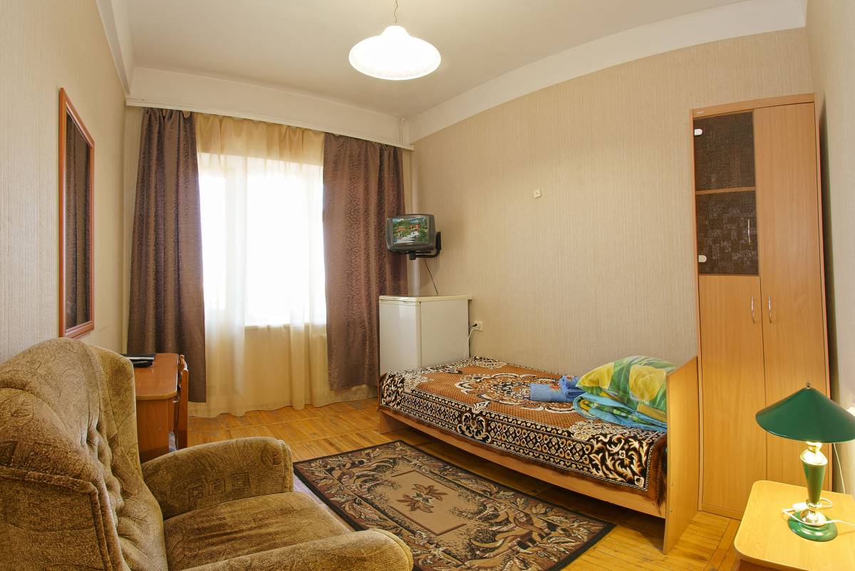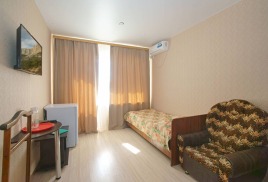 - 1-местный 1-комнатный стандарт. Площадь – 11 кв.м.В номере: односпальная кровать, телевизор, холодильник, санузел, лоджия с видом на море или город.