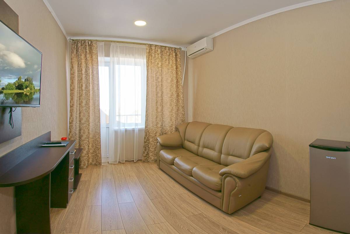 - 2-местный 2-комнатный стандарт. 2-5 этажи. Площадь – 24 кв.м.В номере: спальня с двумя односпальными кроватями, гостиная с мягкой мебелью, телевизор, холодильник, кондиционер, гладильная доска, утюг, чайная посуда, санузел, лоджия с видом на море или город.