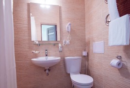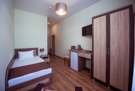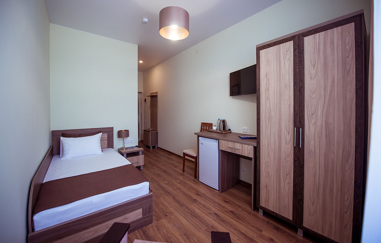 - 1-но местный 1-но комнатный стандарт Премиум. Площадь 15 кв.м. В номере: односпальная кровать 100*200 с ортопедическим матрасом, кондиционер, телевизор, холодильник, чайная станция, ванная комната с душевой кабиной