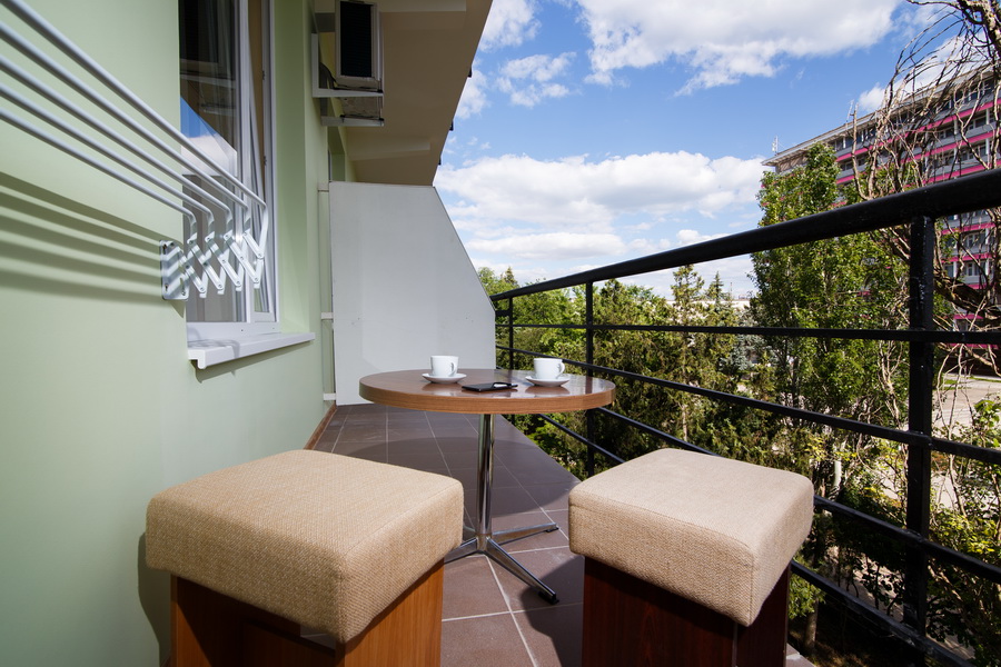 - 2-местный 1-комнатный стандарт улучшенный с балконом / без балкона. Площадь: 11 -15 кв.м. В номере: две односпальные кровати, кондиционер, телевизор, холодильник, чайный набор, санузел с душевой кабиной, балкон.