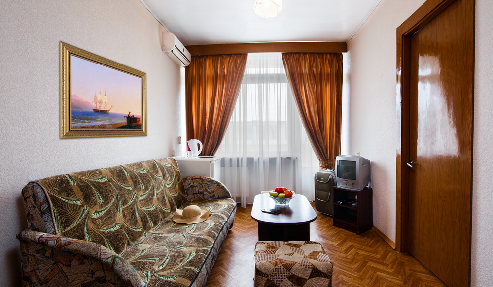 - 2-местный 2-комнатный семейный. Площадь: 32 кв.м. В номере (комнаты отдельные, не проходные): спальня с двуспальной кроватью, гостиная с мягкой мебелью, кондиционер, телевизор, холодильник, чайный набор, сейф, 2 санузела с биде, душ, балкон (вид на море или на парк).