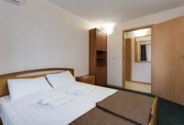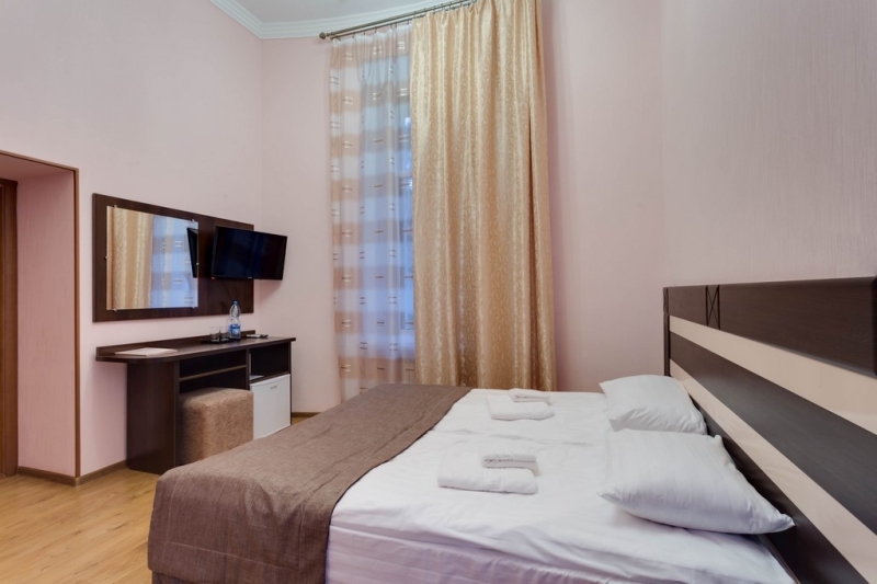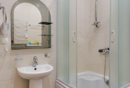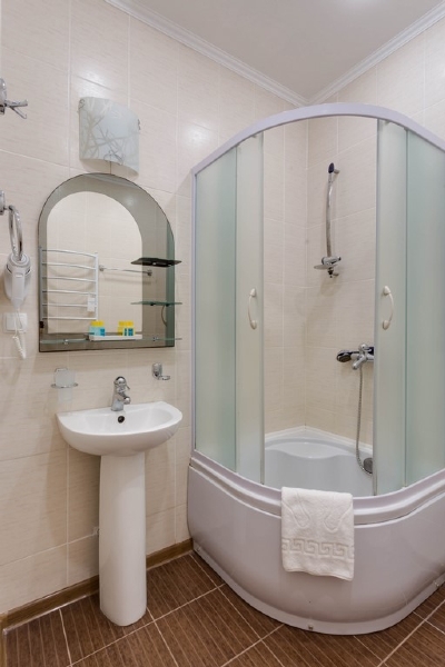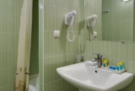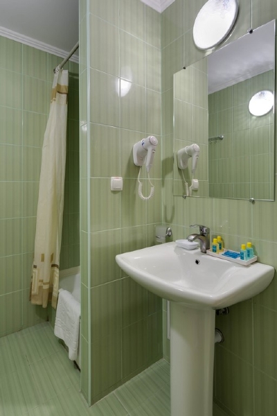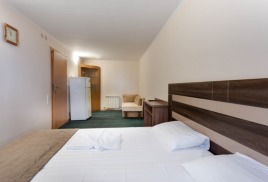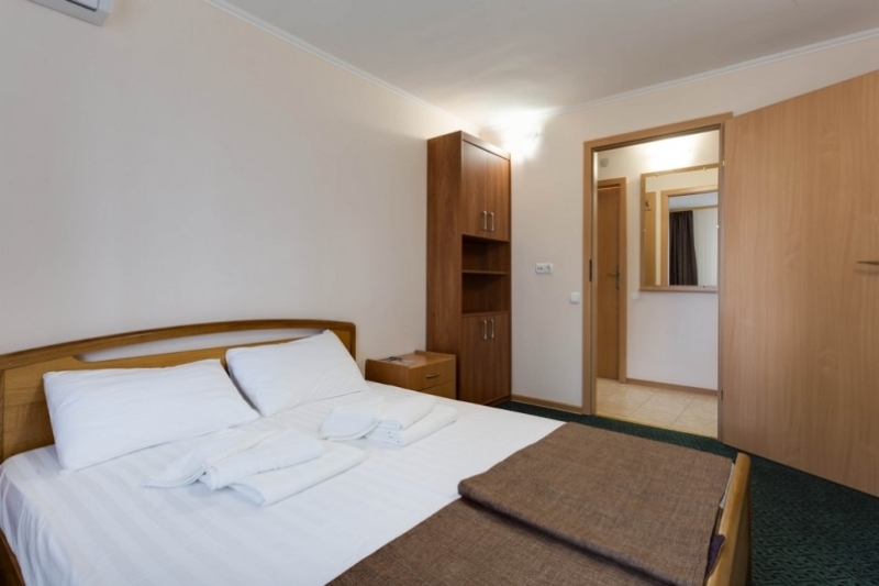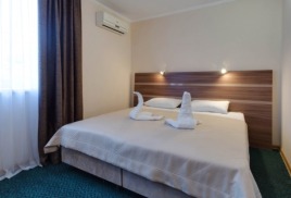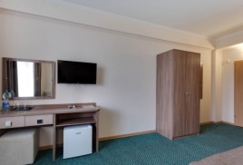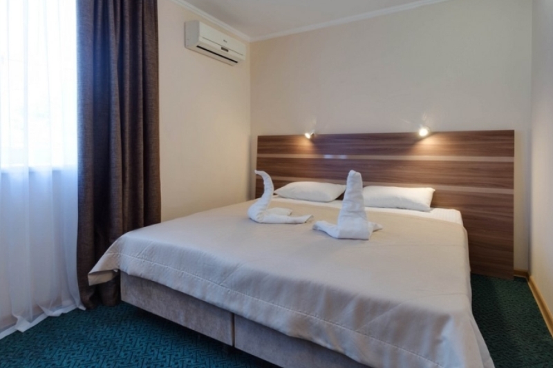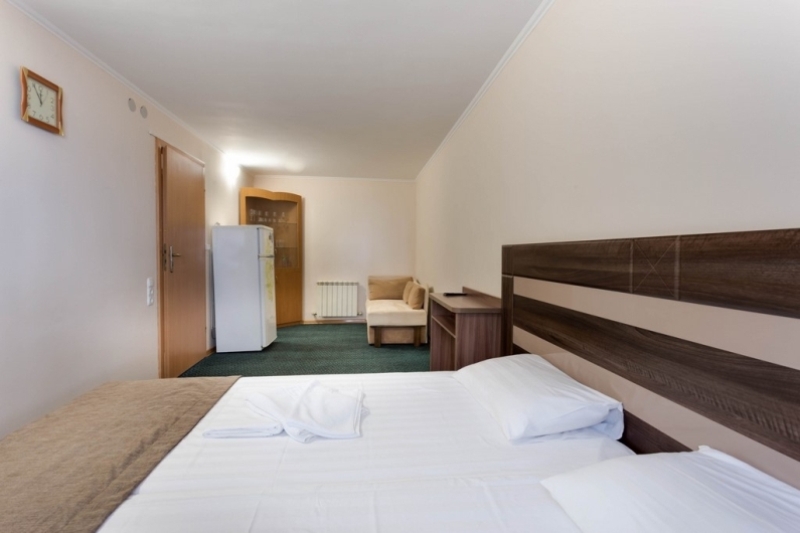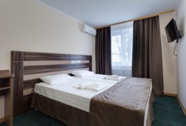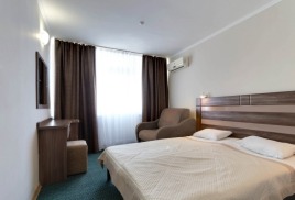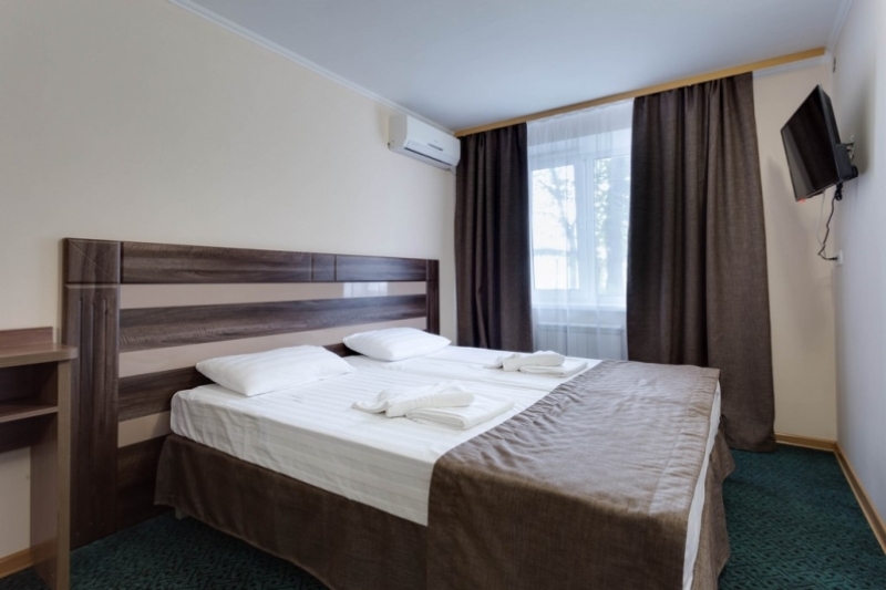 - 2-местный 1-комнатный номер Улучшенный стандарт с балконом (корпус № 5)/без балкона (корпус № 4). Площадь номера 22 кв. км. В номере: 2 односпальные кровати или одна двуспальная кровать и диван, сейф, кондиционер, холодильник, телевизор, санузел с душем, фен, минипарфюмерия. Могут разместиться до 4 – х человек. Вид на море или на парк.