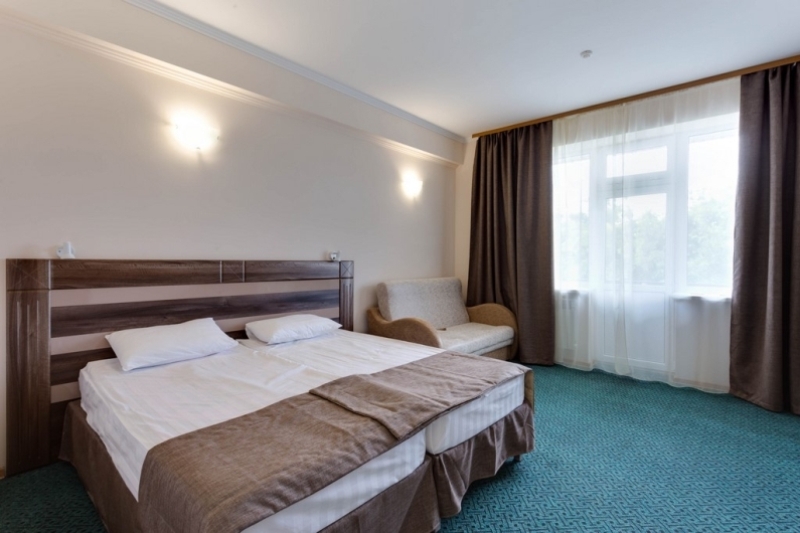 - 2-местный 1-комнатный номер Люкс (корпус Графский). Площадь 14 кв. м. В номере: одна двуспальная кровать, кондиционер, санузел с душем, холодильник, фен, телевизор, сейф , чайник и минипарфюмерия. Вид на парк.