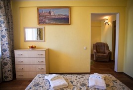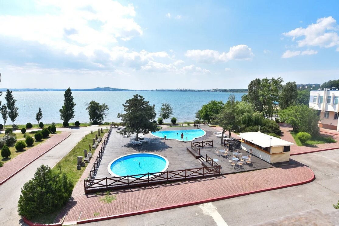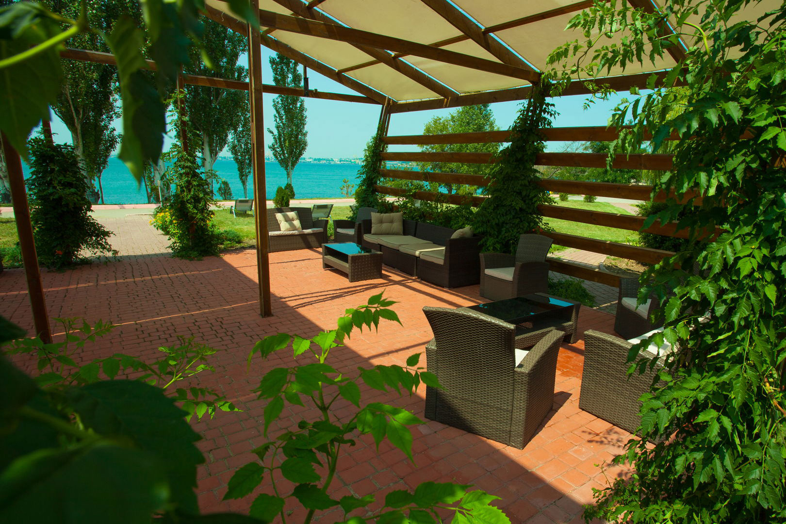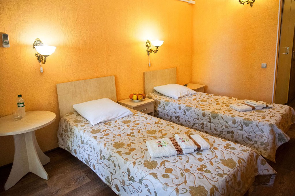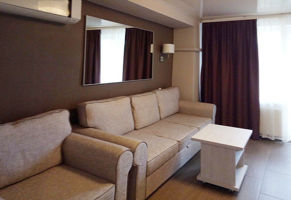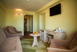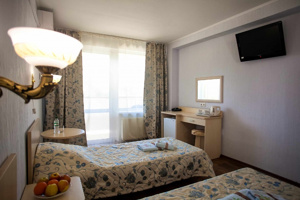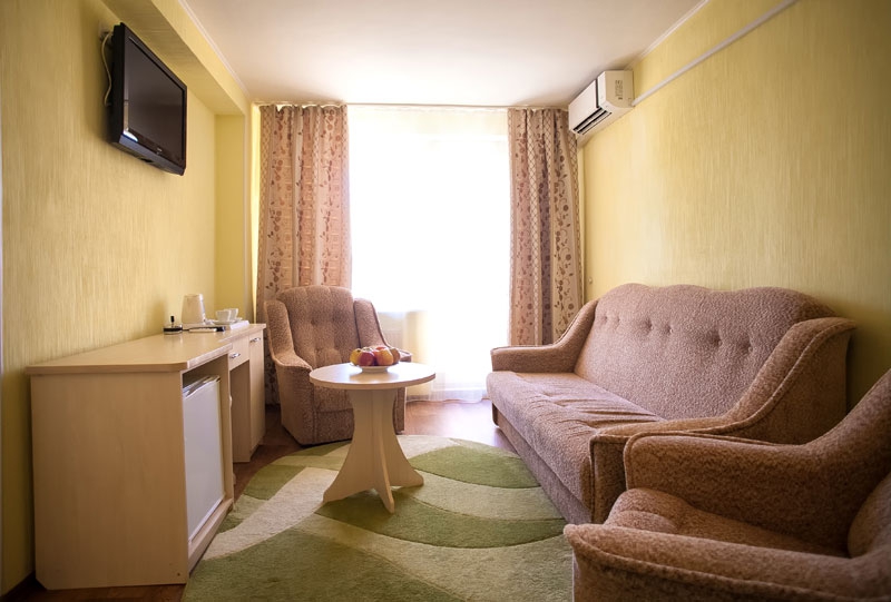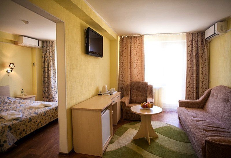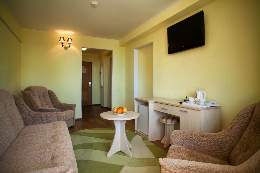 - 2-местный 2-комнатный люкс вид на море: номер состоит из спальной зоны с большой кроватью и прилегающей к ней гостиной с раскладным диваном, ванная комната с большой ванной и отдельной душевой кабинкой, жидкокристаллический телевизор, кондиционер, мини-бар, спутниковое телевидение, бесплатный Интернет Wi-Fi, феном, набором для приготовления чая и кофе, холодильник. С личных балконов номера открывается вид на Керченский залив. Номера расположены на 2-3 этаже.