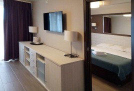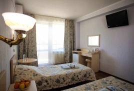 - 2-местный стандарт улучшенный вид на море: комфортабельный номер с двумя отдельными кроватями, санузел с душевой кабиной, жидкокристаллическим телевизором, кондиционером, мини-баром, спутниковым телевидением, бесплатным Интернетом Wi-Fi, балконом, феном, набором для приготовления чая и кофе, холодильник