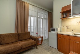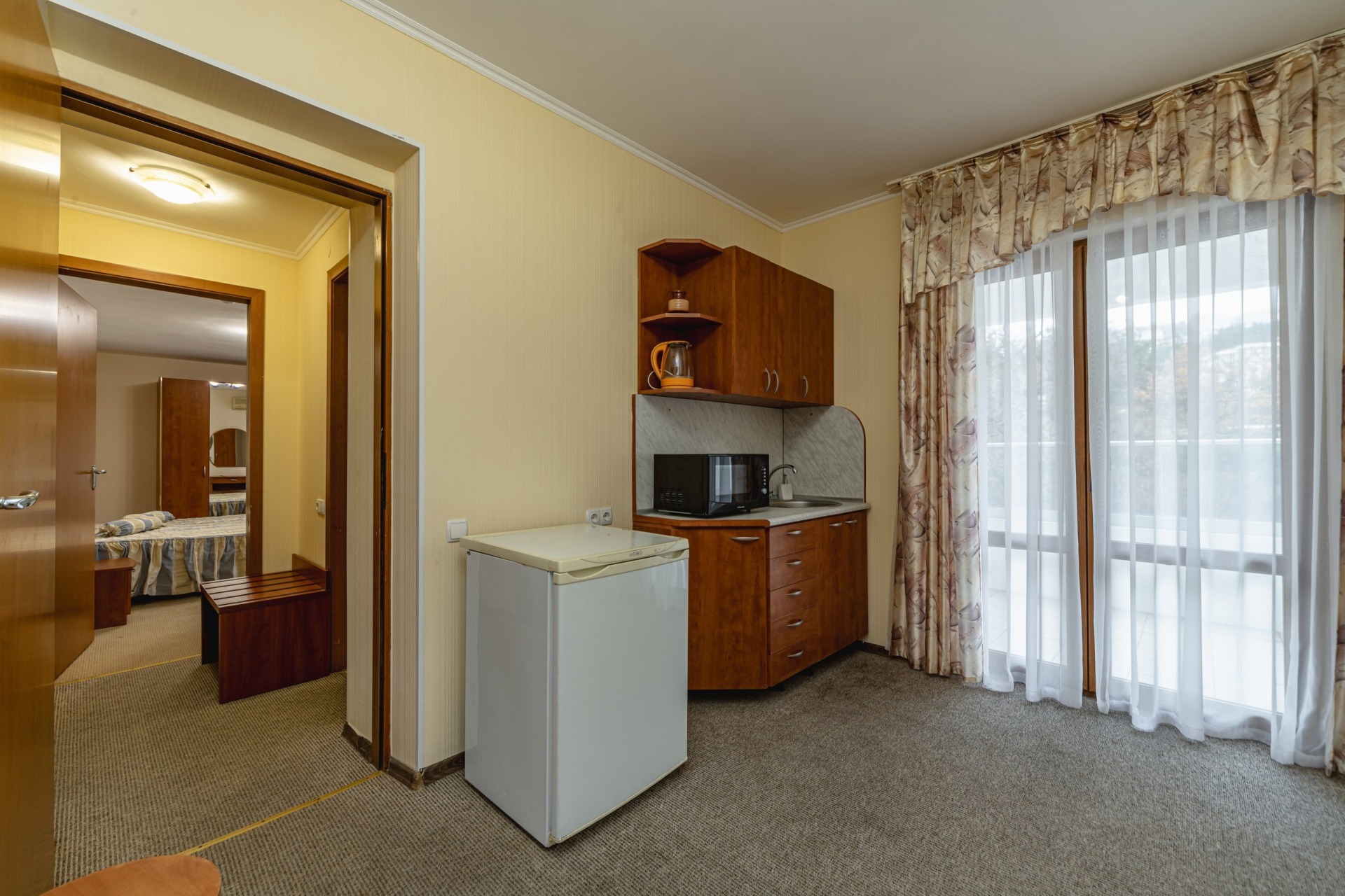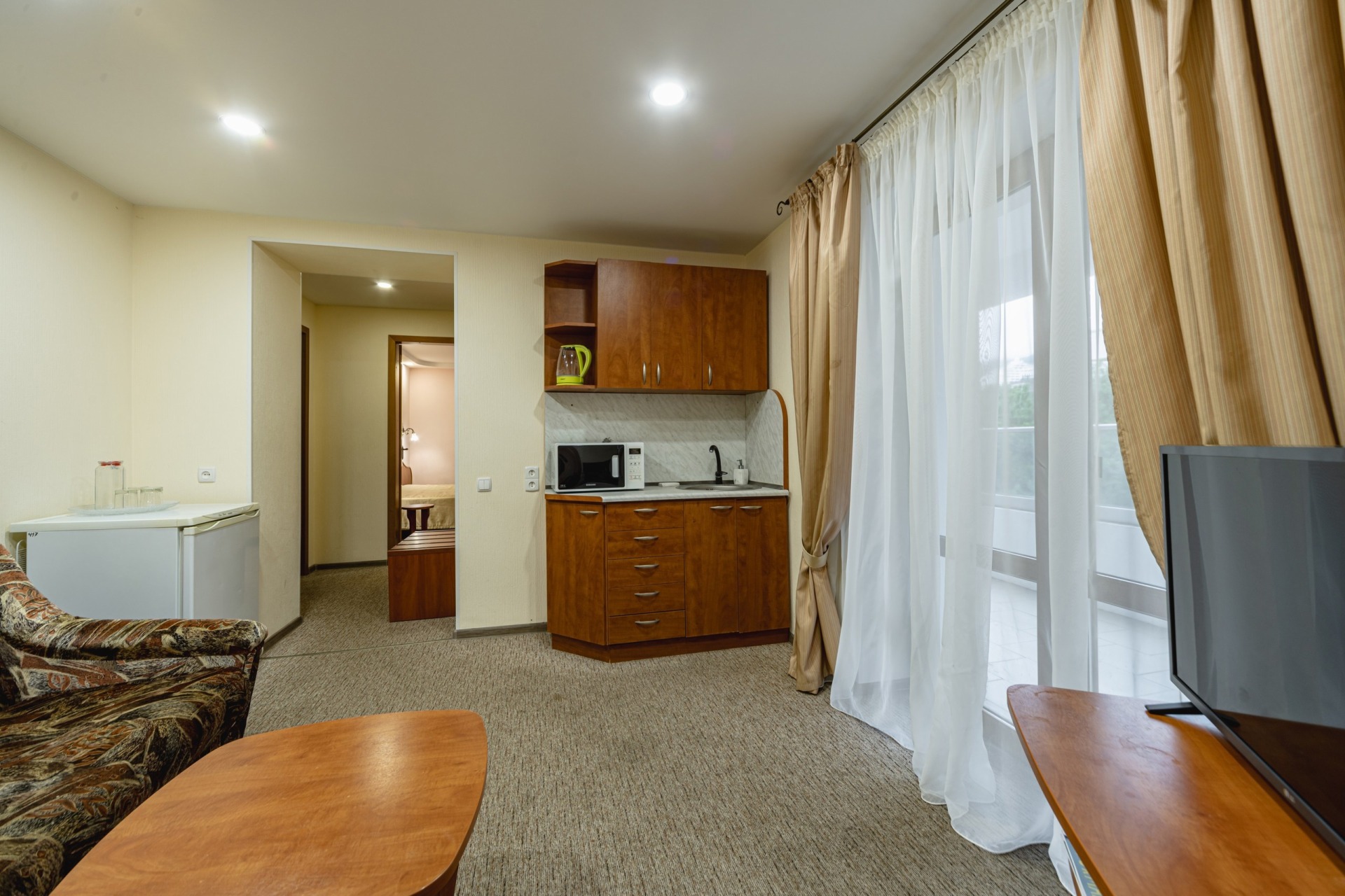 - 2-местный 2-комнатный Повышенной комфортности Семья. В номере: гостиная с мягкой мебелью, спальня с двуспальной кроватью, санузел с душем, телевизор, холодильник, бойлер, кондиционер, мини-кухня, набор посуды, микроволновая печь, электрочайник, балкон.