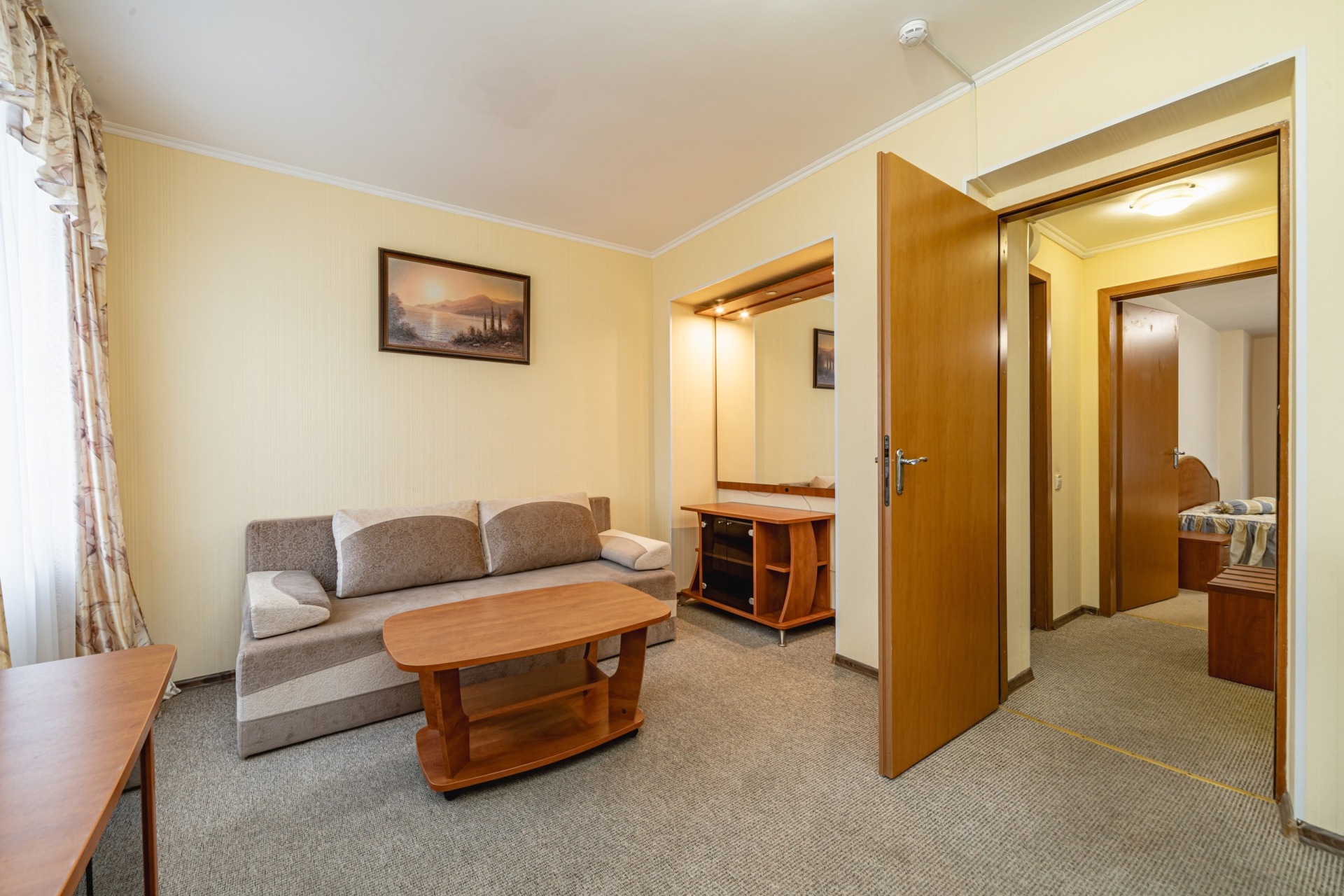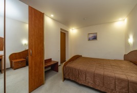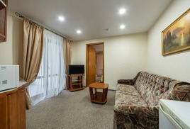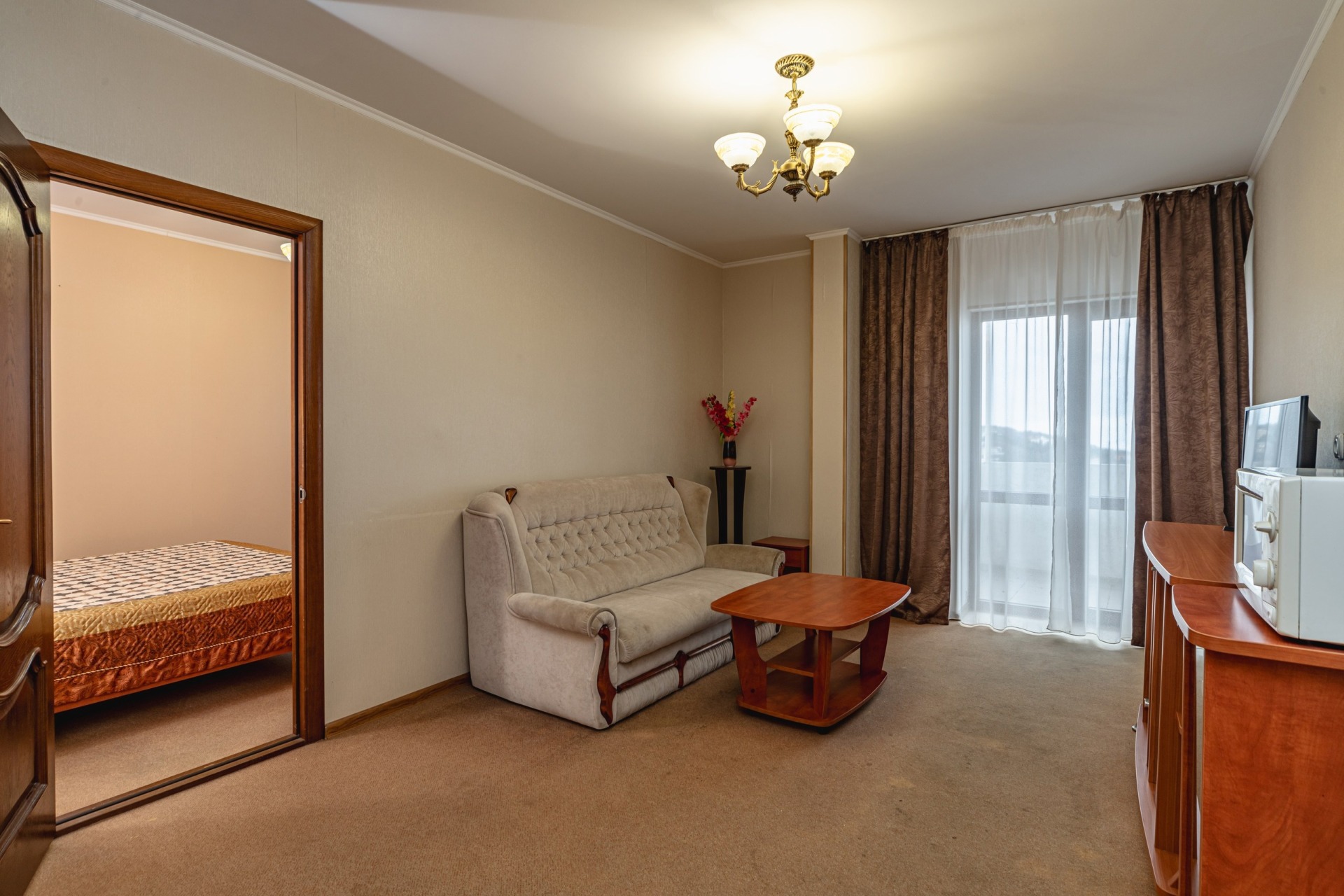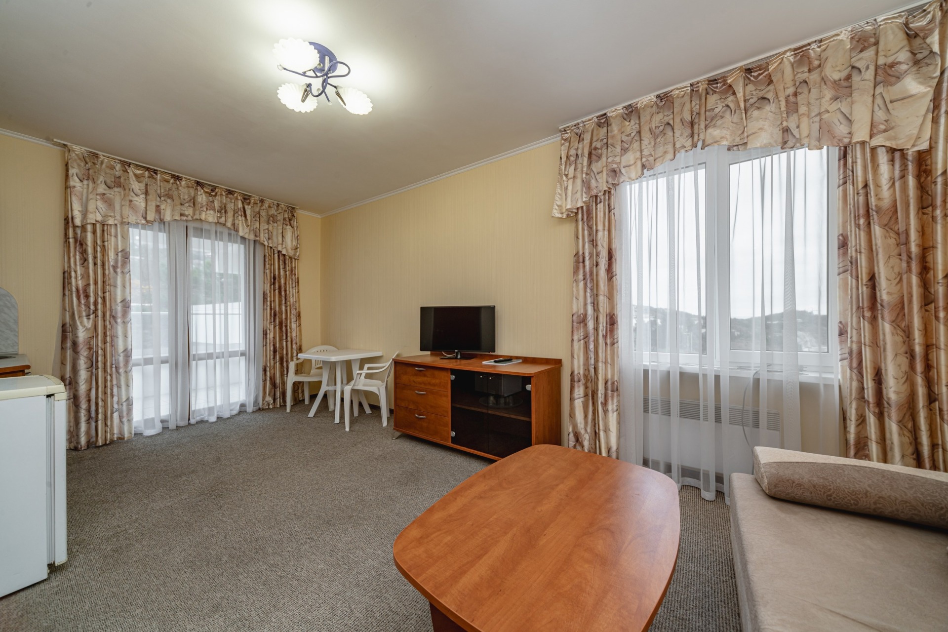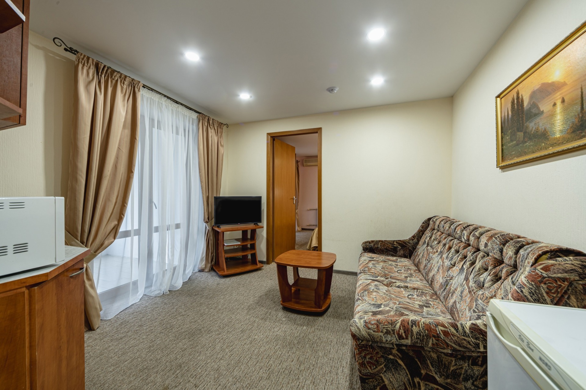 - 2-местный 2-комнатный Повышенной комфортности Север / Юг. В номере: гостиная с мягкой мебелью, спальня с двуспальной кроватью, санузел с душем, телевизор, холодильник, бойлер, кондиционер, балкон.