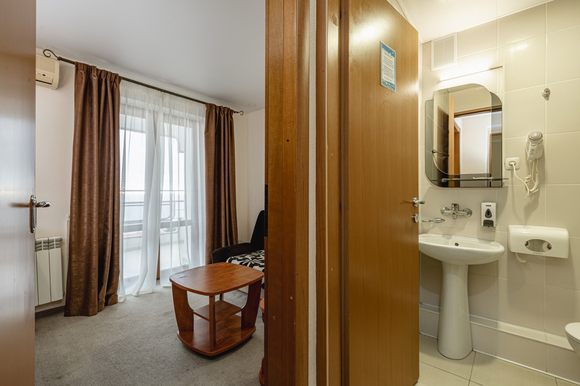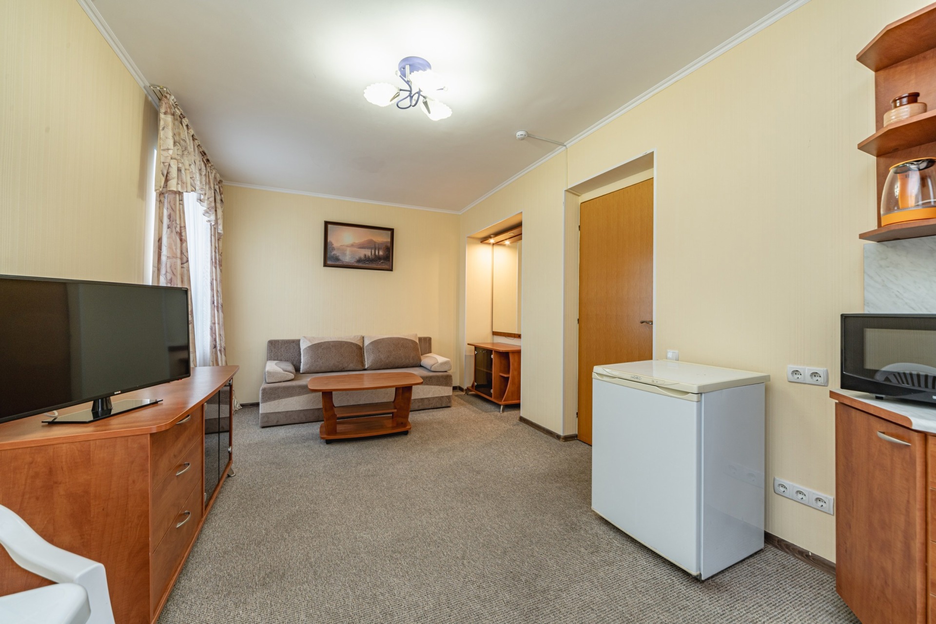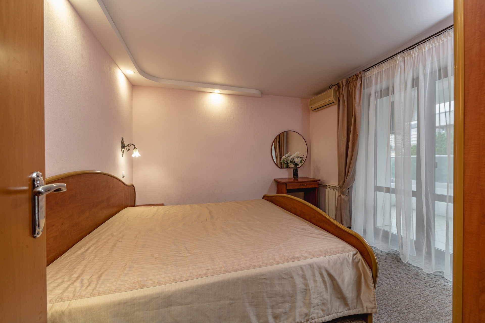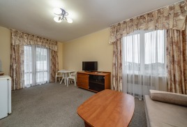 - 2-местный 2-комнатный Повышенной комфортности Север / Юг. В номере: гостиная с мягкой мебелью, спальня с двуспальной кроватью, санузел с душем, телевизор, холодильник, бойлер, кондиционер, балкон.