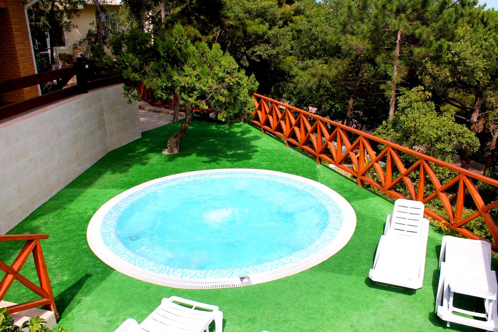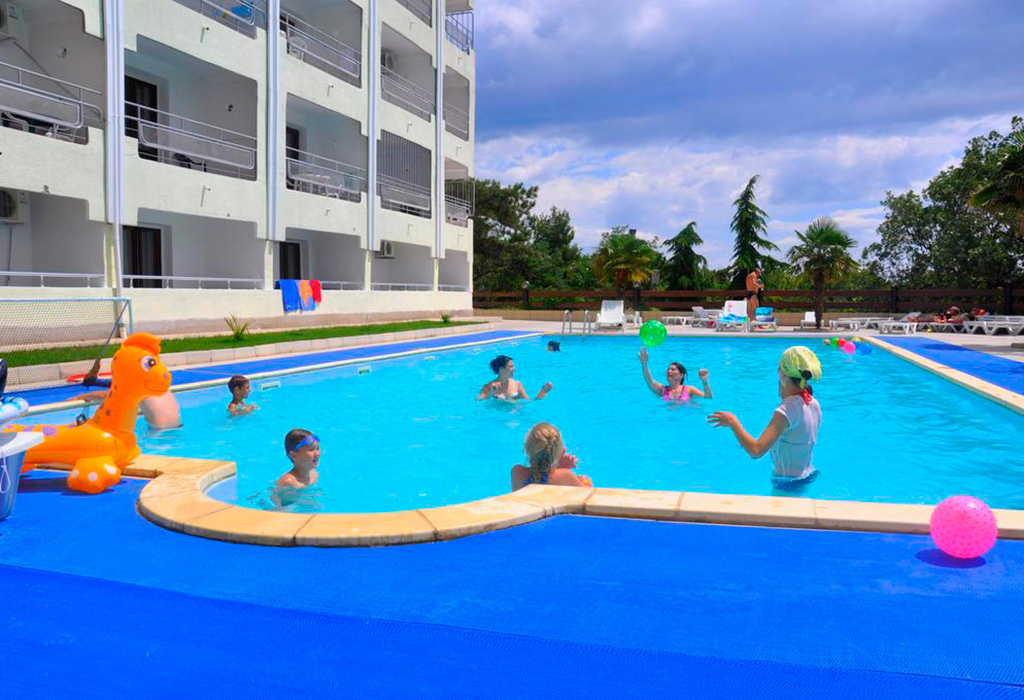 - открытый бассейн 8х15 м с пресной водой без подогрева, рядом с бассейном организована зона отдыха с лежаками
