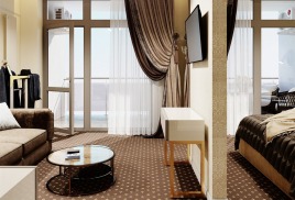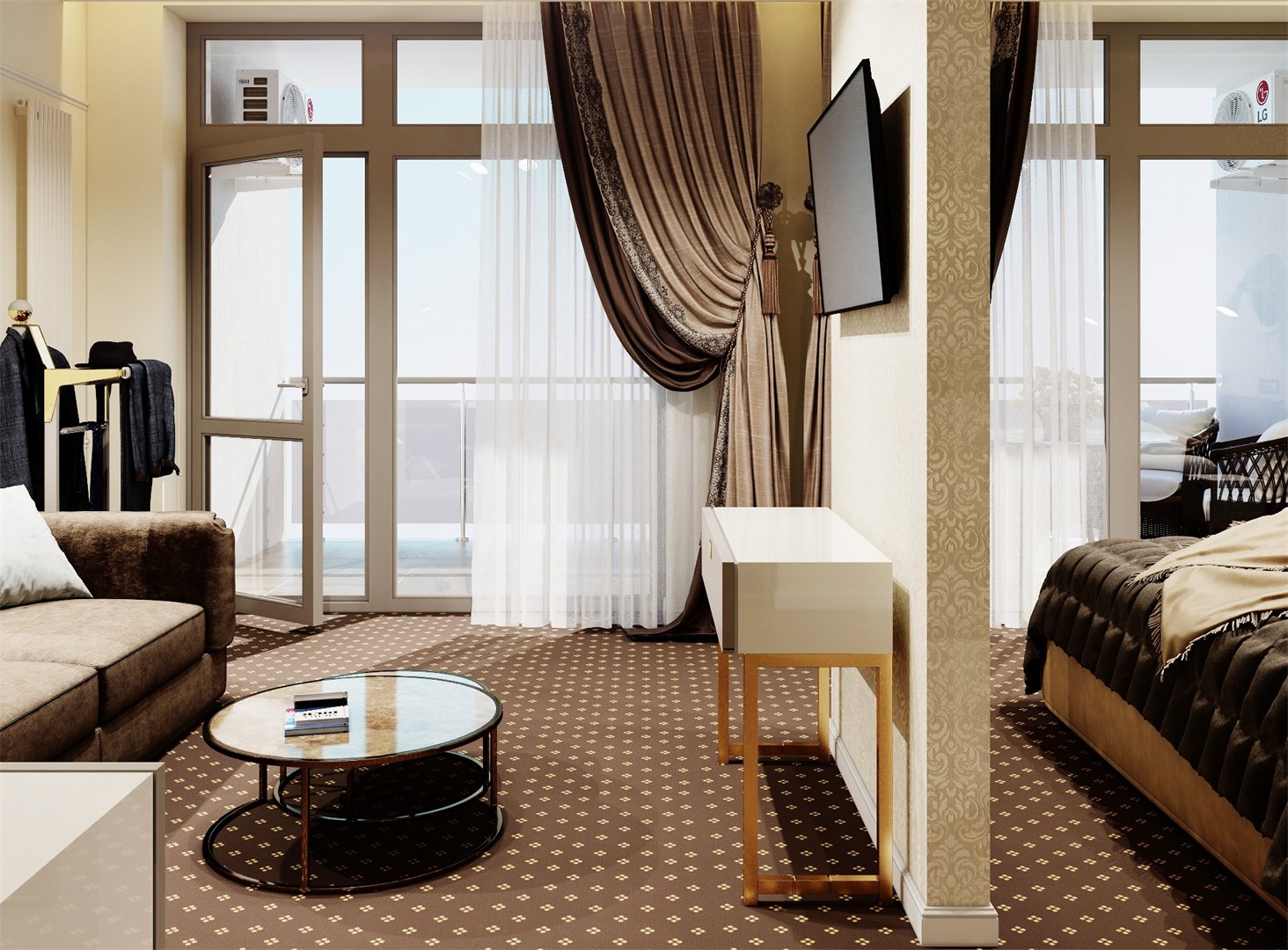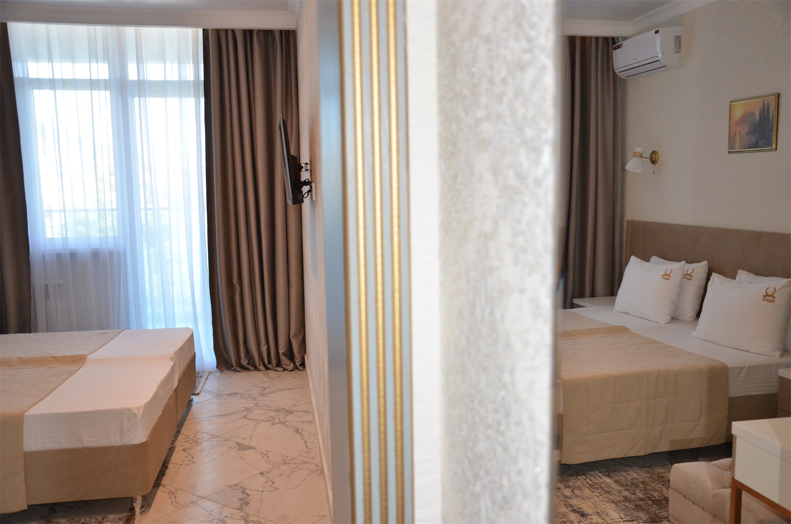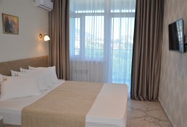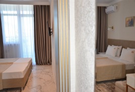 - 2-х местный 2-комнатный Джуниор-сюит Улучшенный (40 кв.м) - две кровати, 2-х местный диван, совмещенный санузел, биде, душевая, зеркало, стол, 2 пуфа, шкаф для одежды, вешалки, полка для багажа, кресло, 2 TV с пультом управления, холодильник, сейф, 2 прикроватные тумбочки, индивидуальные осветительные приборы, набор посуды (чайный набор, набор столовой посуды, набор столовых приборов, штопор), электрический чайник, фен, комплект банных полотенец, комплект постельных принадлежностей, тапочки, халаты, средства личной гигиены, кондиционер. Панорамные окна (кроме 618 и 804). Балкон с комплектом мебели. Wi-Fi в каждом номере. Расположены на 6, 8 и 9 этажах корпуса.