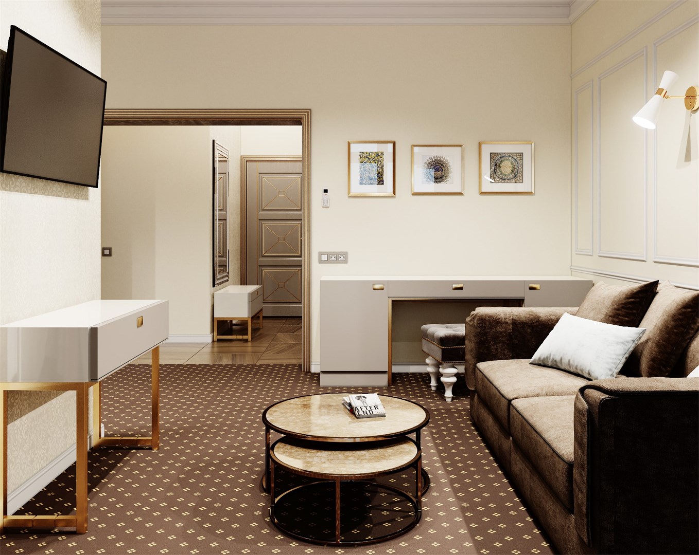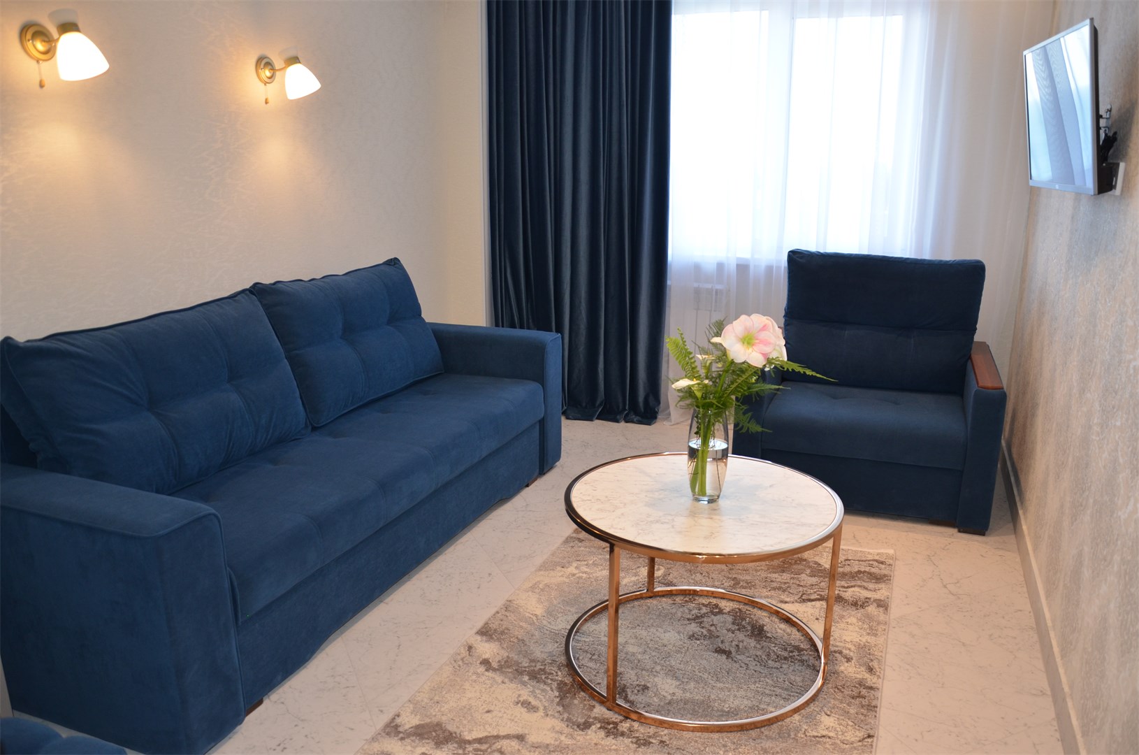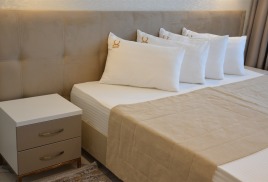 - 2-х местный 2-х комнатный Люкс Улучшенный (40 кв.м) - две кровати, 2-х местный диван, совмещенный санузел, биде, душевая, зеркало, стол, шкаф для одежды, вешалки, полка для багажа, 2 TV с пультом управления, холодильник, сейф, 2 пуфа, кресло, 2 прикроватные тумбочки, индивидуальные осветительные приборы, набор посуды (чайный набор, набор столовой посуды, набор столовых приборов, штопор), электрический чайник, фен, комплект банных полотенец, комплект постельных принадлежностей, тапочки, халаты, средства личной гигиены, кондиционер. Панорамные окна. Балкон с комплектом мебели. Wi-Fi в каждом номере. Расположены на 9 этаже корпуса.