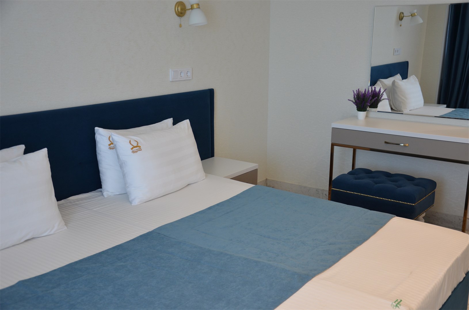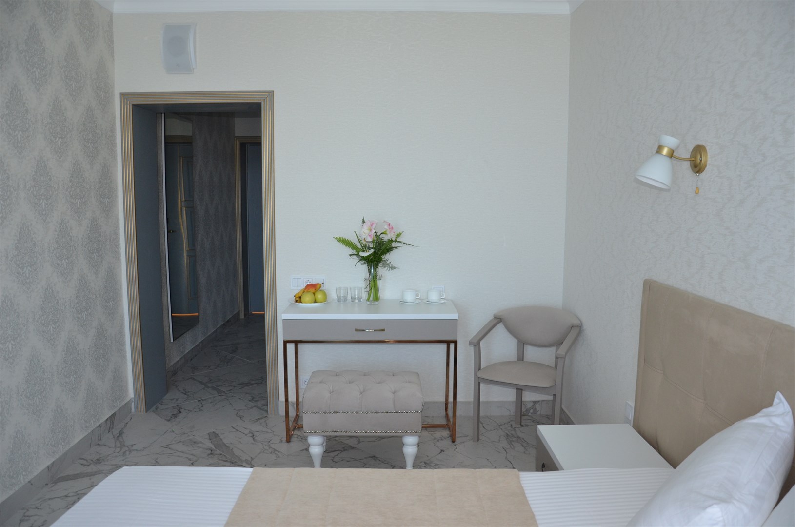 - 2-х местный 2-комнатный Джуниор-сюит (40 кв.м) - две кровати, 2-х местный диван, совмещенный санузел, душевая, зеркало, стол, 2 пуфа, шкаф для одежды, вешалки, полка для багажа, TV с пультом управления, холодильник, 2 прикроватные тумбочки, индивидуальные осветительные приборы, набор посуды (1 графин, 2 блюдца, 2 чашки, 2 чайных ложки, 2 стакана), электрический чайник, фен, комплект банных полотенец, комплект постельных принадлежностей, средства личной гигиены, кондиционер. Балкон с комплектом мебели. Wi-Fi в каждом номере. Расположены на 2 - 8 этажах корпуса.