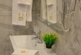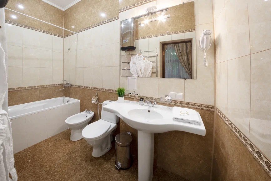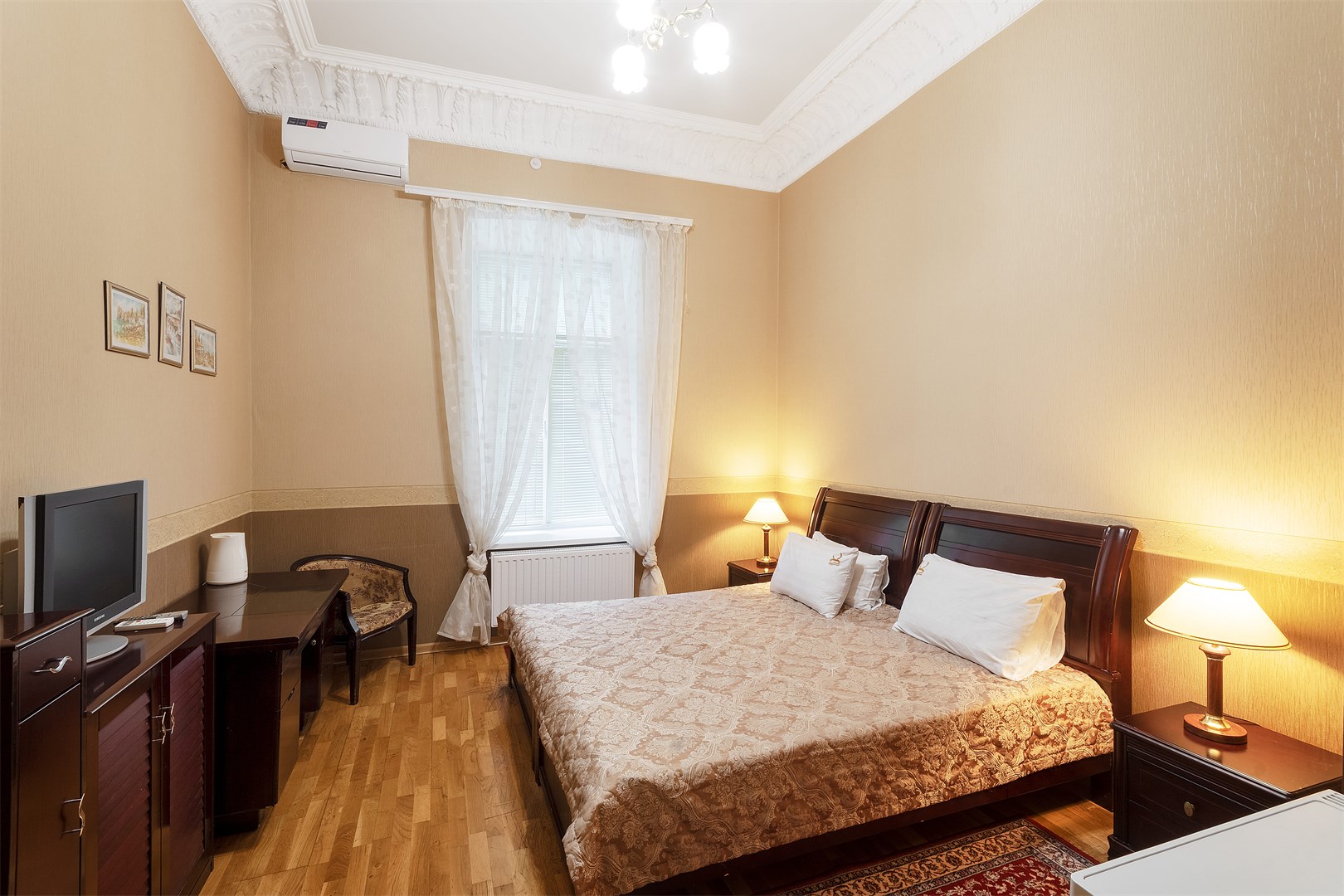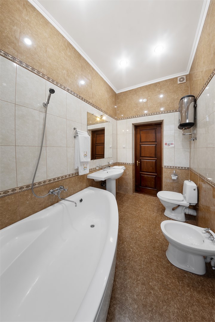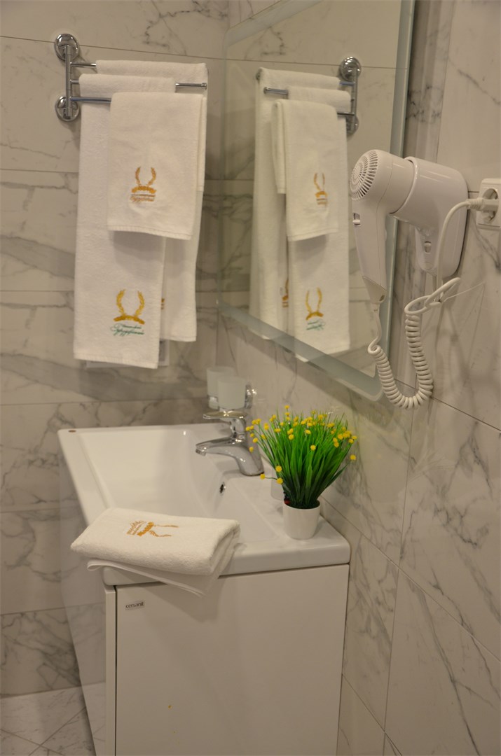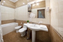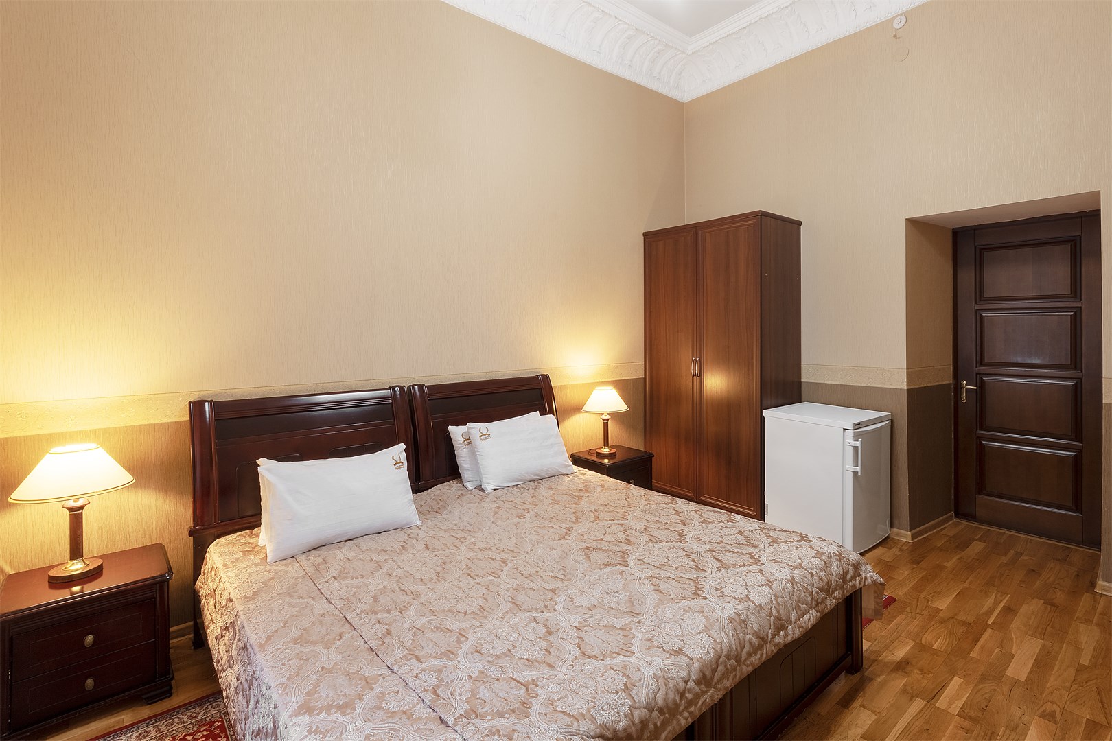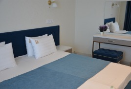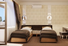- 2-х местный Стандарт (25 кв.м) - две кровати, отдельно стоящие, совмещенный санузел, бойлер, большая ванна, биде, зеркало, стол, шкаф для одежды, вешалки, полка для багажа, TV с пультом управления, холодильник, 2 стула, 2 прикроватные тумбочки, индивидуальные осветительные приборы, набор посуды (1 графин, 2 блюдца, 2 чашки, 2 чайных ложки, 2 стакана), электрический чайник, комплект банных полотенец, комплект постельных принадлежностей, набор мини парфюмерии, фен, кондиционер. Номер без балкона. Wi-Fi в каждом номере.