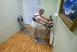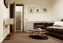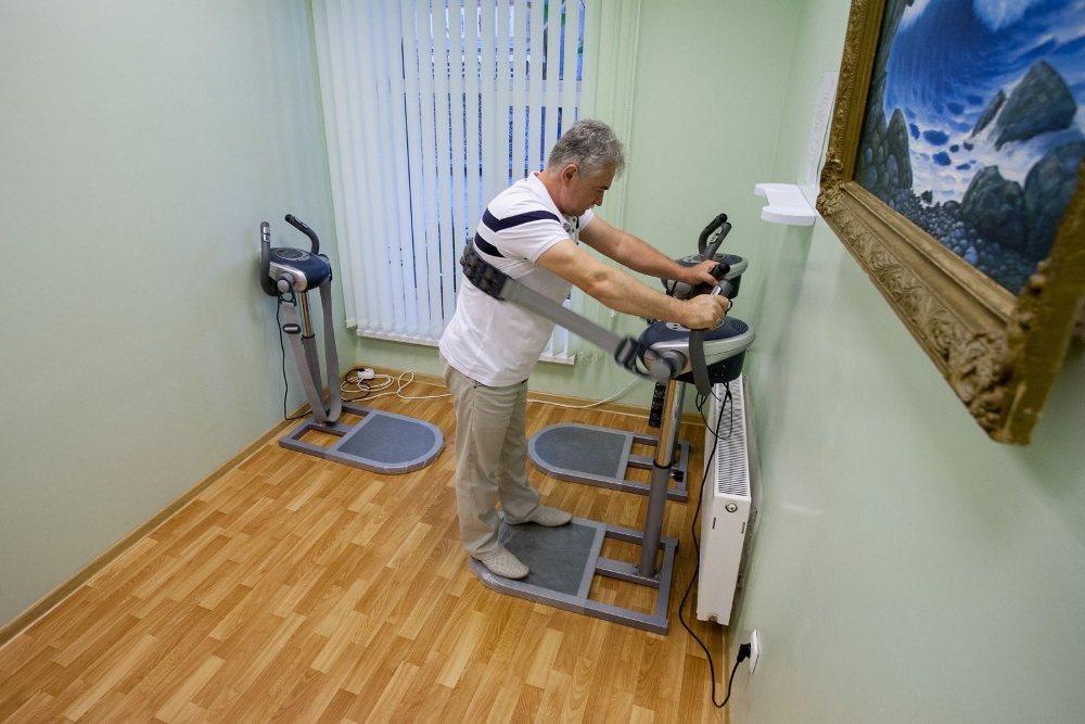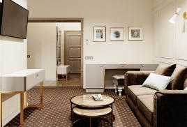 - 2-х местный Джуниор-сюит (для МГН) (40 кв.м) - цокольный этаж с отдельной входной группой, пандус. Две кровати, 2-х местный диван, совмещенный санузел с опорами, душевая, зеркало, стол, шкаф для одежды, вешалки, полка для багажа, TV с пультом управления, холодильник, 2 прикроватные тумбочки, индивидуальные осветительные приборы, набор посуды (1 графин, 2 блюдца, 2 чашки, 2 чайных ложки, 2 стакана), электрический чайник, фен, комплект банных полотенец, комплект постельных принадлежностей, средства личной гигиены, кондиционер. Наличие кнопки экстренного вызова сотрудника санатория. Балкон с комплектом мебели. Wi-Fi в каждом номере. Расположены на цокольном этаже корпуса.