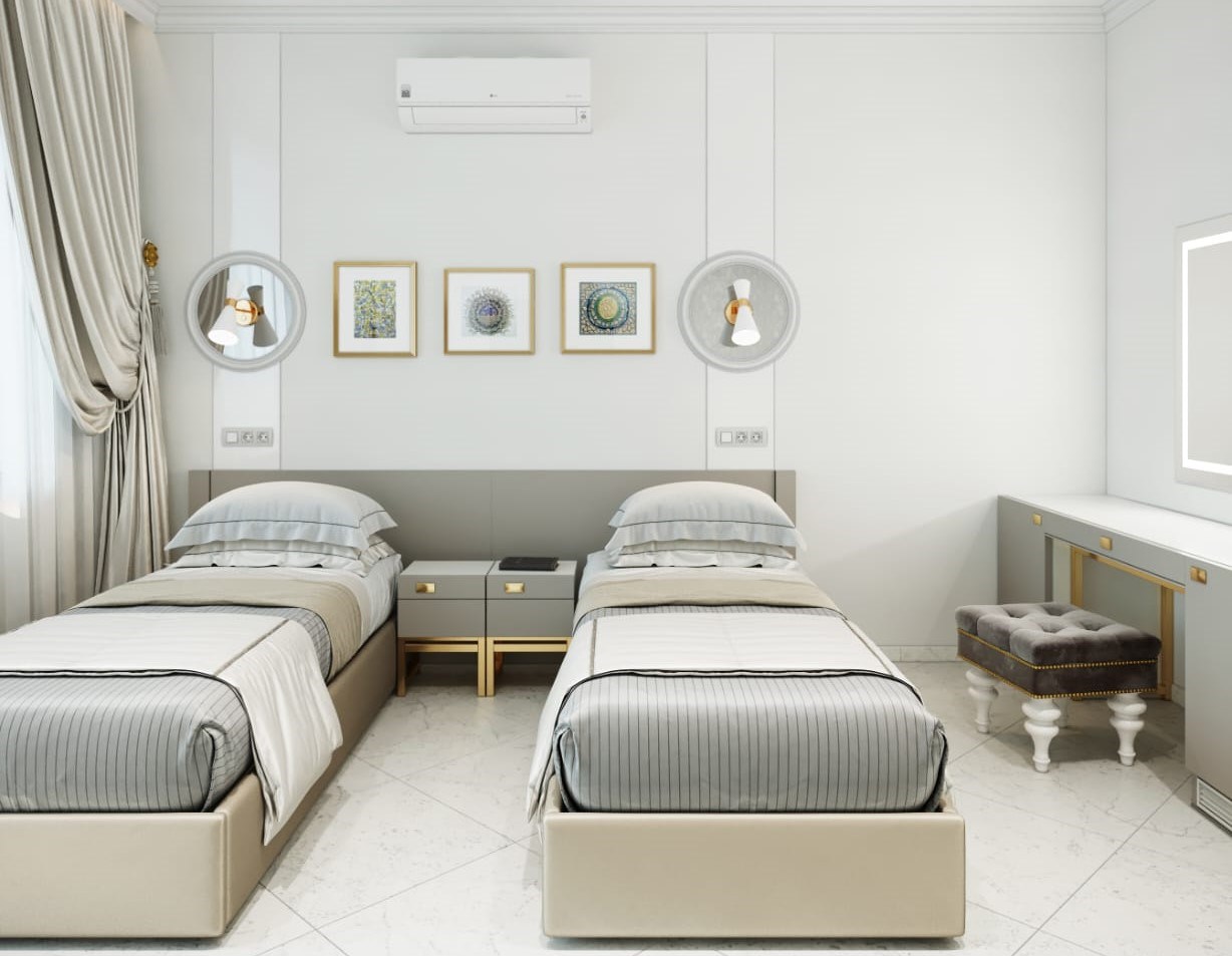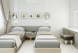 - 2-х местный 4-х комнатный Сюит (291 кв.м) - одна 2-х спальная кровать, две кровати отдельно стоящие, две кровати для детей, в каждой спальне: кондиционер, шкаф для одежды, вешалки, прикроватные тумбочки, индивидуальные осветительные приборы, TV с пультом управления. В детской комнате: две прикроватные тумбочки, напольная вешалка. В гостинной: TV с пультом управления, мягкий уголок, журнальный столик, комод. В обеденном зале: большой обеденный стол, кухонный гарнитур, посуда (чайный набор, набор столовой посуды, набор столовых приборов, набор кастрюль, фужеры, бокалы, стаканы, штопор), холодильник, электрический чайник, микроволновая плита, кулер для воды, кофе-машина. Два совмещенных санузла, комплект банных полотенец, набор мини парфюмерии, набор махровых ковриков для санузла и ванной, тапочки, халаты, фен, сушка для белья, сейф. Индивидуальный двор с детской площадкой. WI-FI.