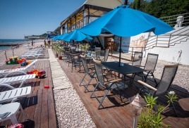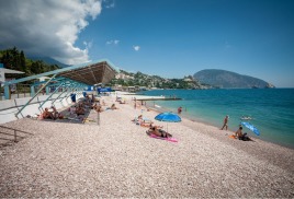 Пляж: галечный собственный расположен в 200 метрах от корпусов, протяженностью 240 метров. Пляж оборудован раздевалками, душем и туалетами, медпунктом, теневыми навесами, лежаками (входят в стоимость).