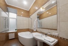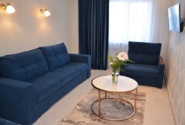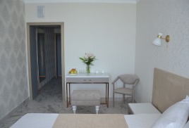 - 2-х местный 2-х комнатный Люкс (40-44 кв.м) - две кровати, 2-х местный диван, совмещенный санузел, душевая, зеркало, стол, 2 пуфа, шкаф для одежды, вешалки, полка для багажа, кресло, TV с пультом управления, холодильник, сейф, 2 прикроватные тумбочки, индивидуальные осветительные приборы, набор посуды (1 графин, 2 блюдца, 2 чашки, 2 чайных ложки, 2 стакана, 2 бокала, штопор), электрический чайник, фен, комплект банных полотенец, комплект постельных принадлежностей, тапочки, халаты, средства личной гигиены, кондиционер. Балкон с комплектом мебели. Wi-Fi в каждом номере. Расположены на 2 - 8 этажах корпуса.