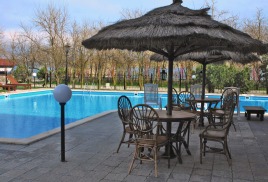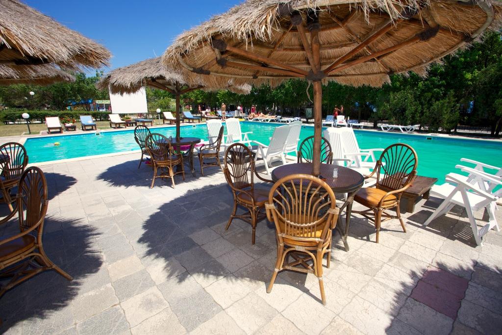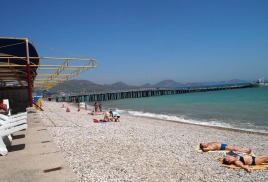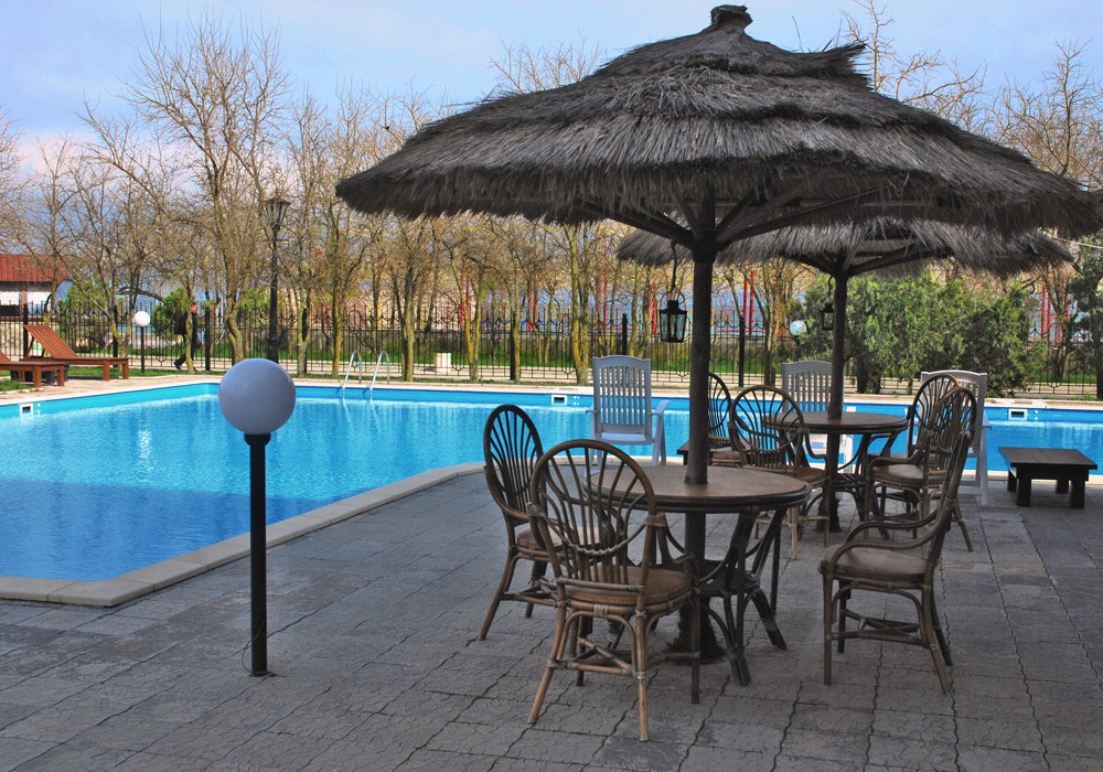 Пляж: 50-100 метров от корпусов, галечный, собственный, оборудован теневыми навесами. Прокат шезлонгов за дополнительную плату. Прокат водных мотоциклов, катамаранов.