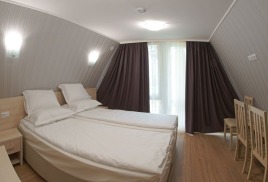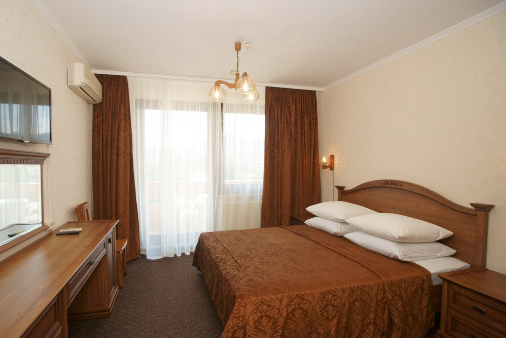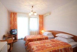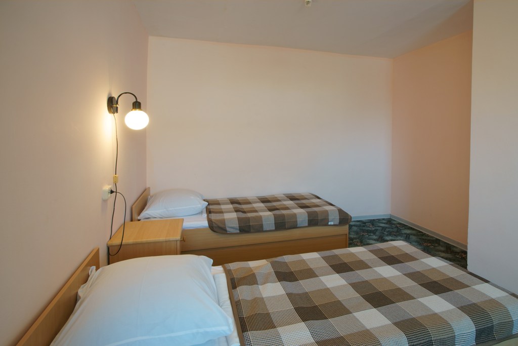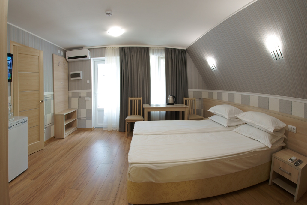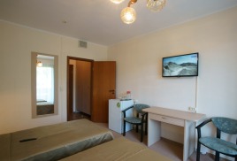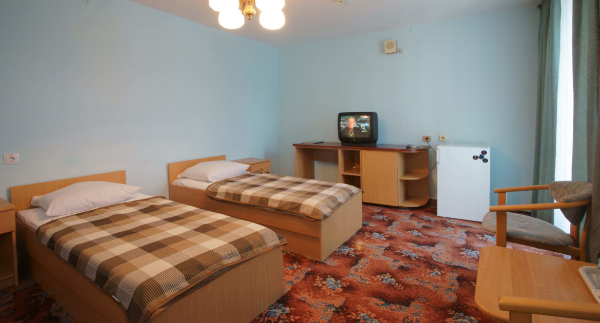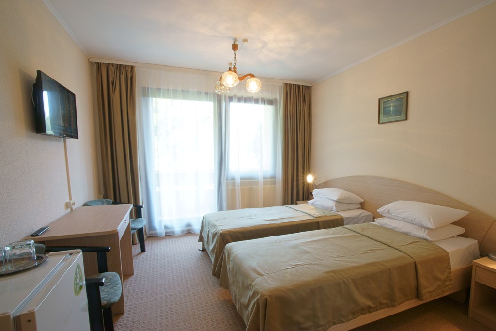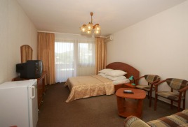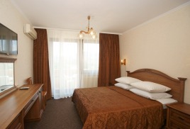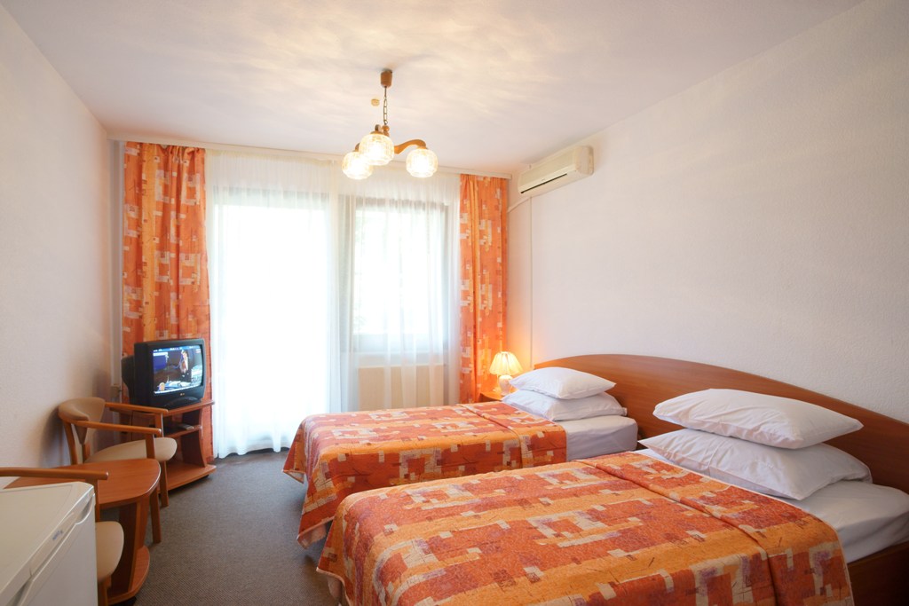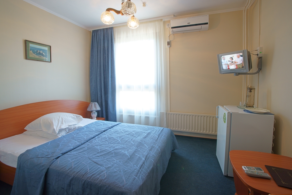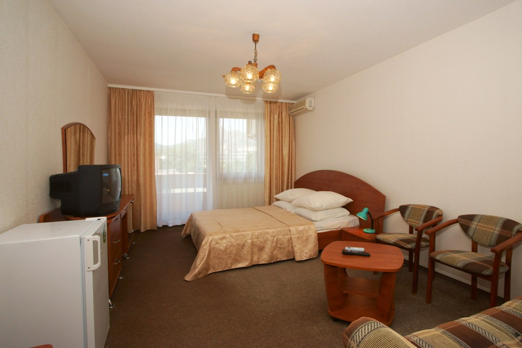 - 2-местный 1-комнатный номер. Площадь: 15 кв.м. В номере: две односпальные кровати или одна двухспальная, телевизор, холодильник, кондиционер, санузел, балкон.