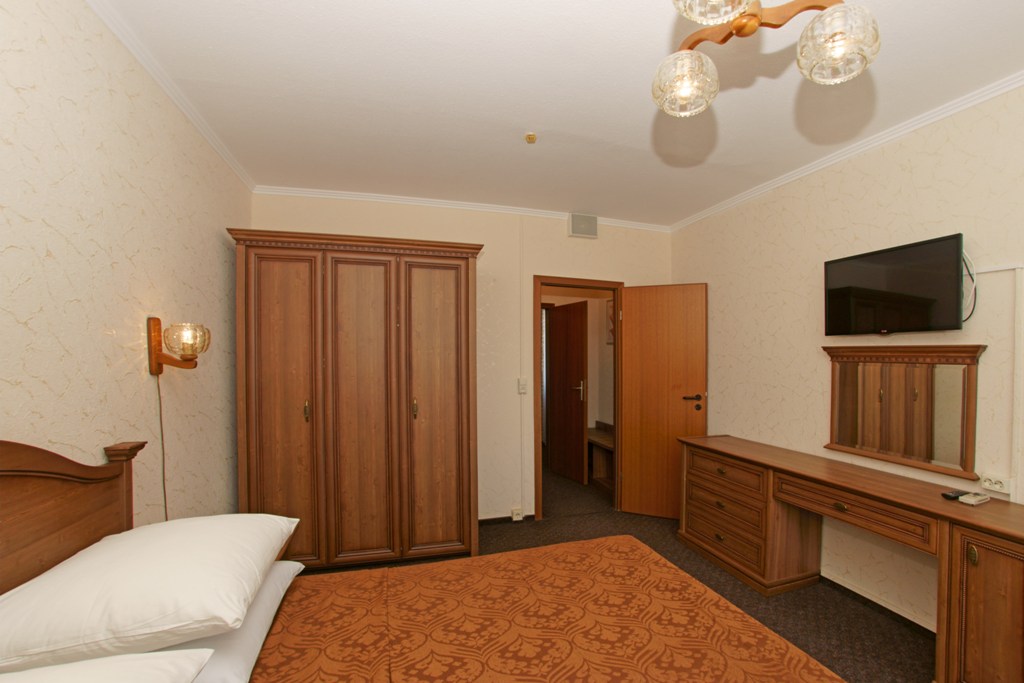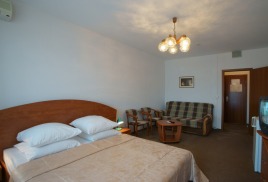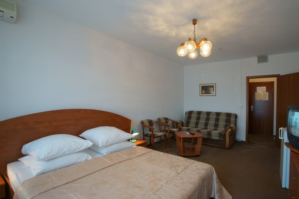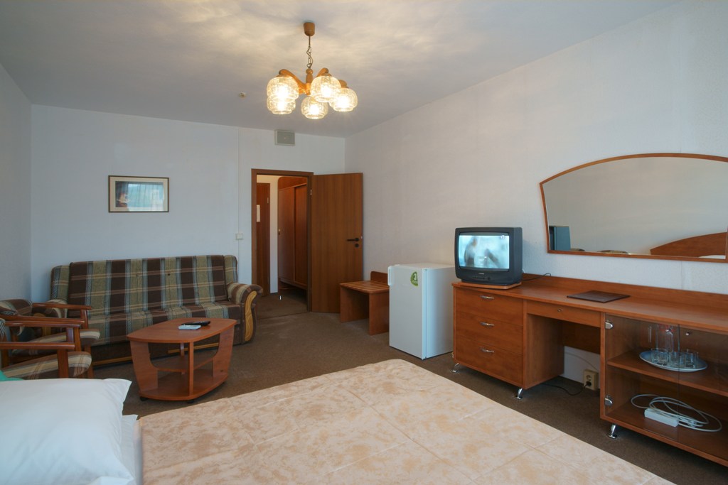 - 2-местный 2-комнатный номер. Площадь: 33 кв.м. В номере: спальня с двуспальной кроватью, гостиная с креслом-кроватью, телевизор, холодильник, кондиционер, утюг, гладильная доска, санузел, балкон.