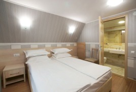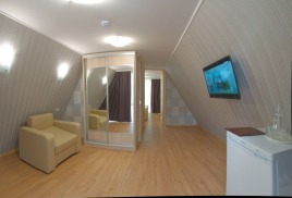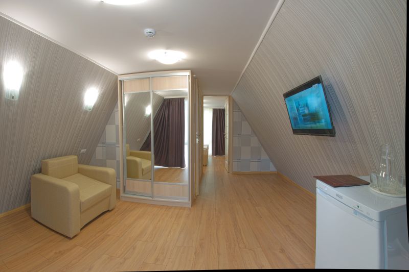 - 2-местный 2-комнатный номер. Площадь 36 кв.м( 1-й этаж) , 46 кв.м ( 2 этаж). В номере: удобства (совмещенный санузел с душем), спутниковое ТВ, холодильник, кондиционер, набор мебели: 2-спальная кровать, односпальная кровать, кресло-кровать, прикроватные тумбы, шкаф, вешалка, багажная тумба гладильная доска, утюг.