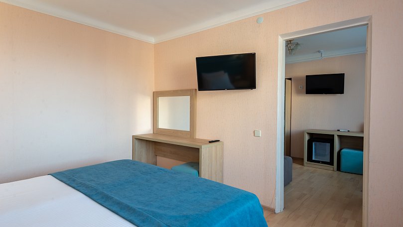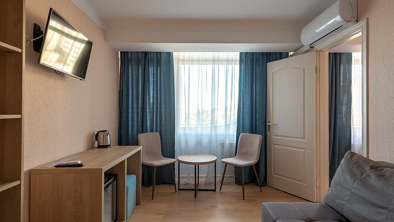 - 2-комнатный 2-местный номер Джуниор сюит. Корпус № 11 Площадь номера 30 кв. м. В номере: спальня с двуспальной кроватью или двумя односпальными, гостиная с мягкой мебелью, кондиционер, телевизор, холодильник, электрочайник, санузел с душем, фен, халат, тапочки, балкон. Прямой вид на море.