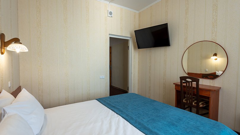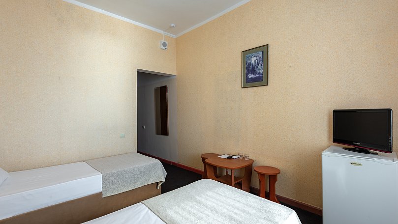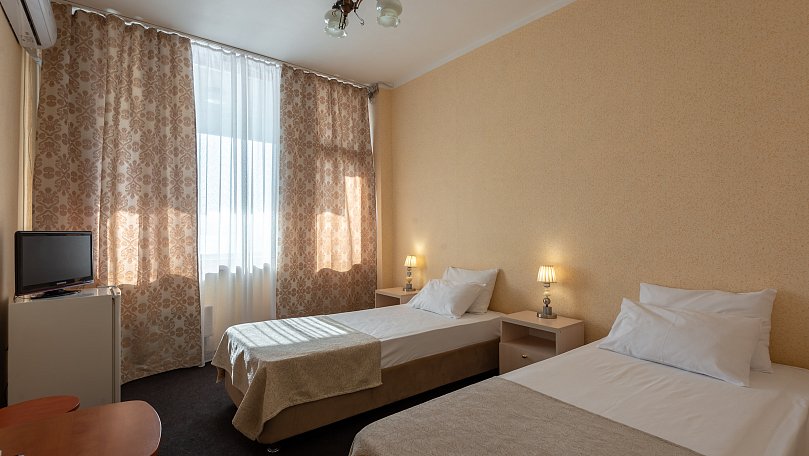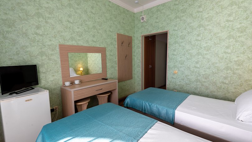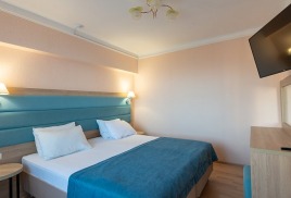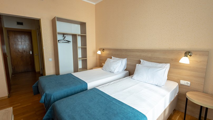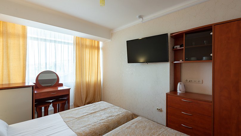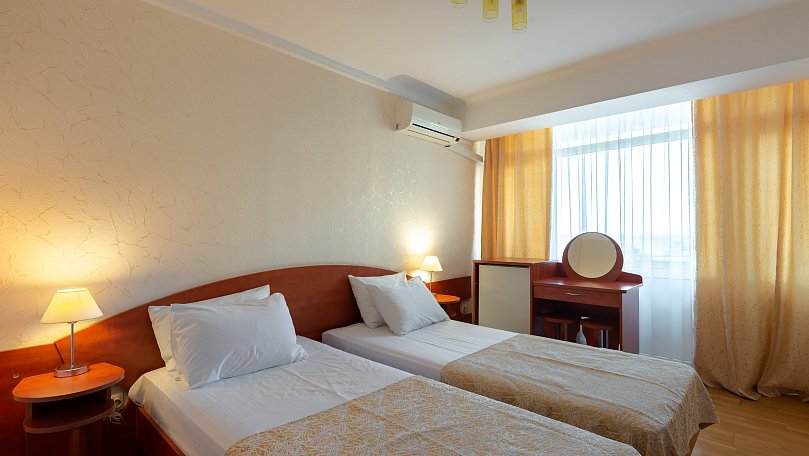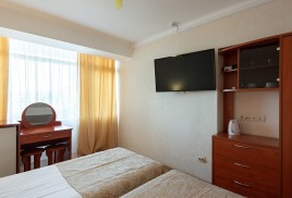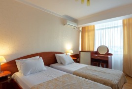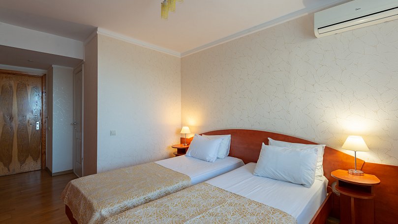 - 2-местный 1-комнатный номер стандарт. Корпус № 11.Площадь номера 18 кв. м. В номере: 2 односпальные кровати , холодильник, телевизор, кондиционер, санузел с душем, балкон. Прямой или боковой вид на море.