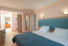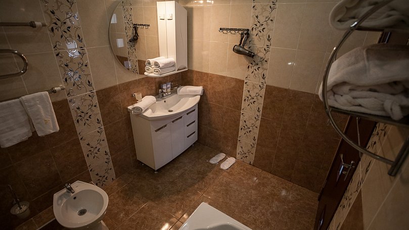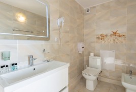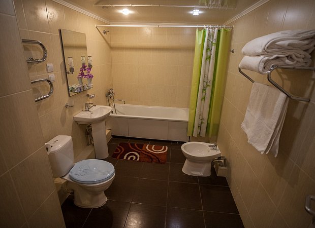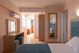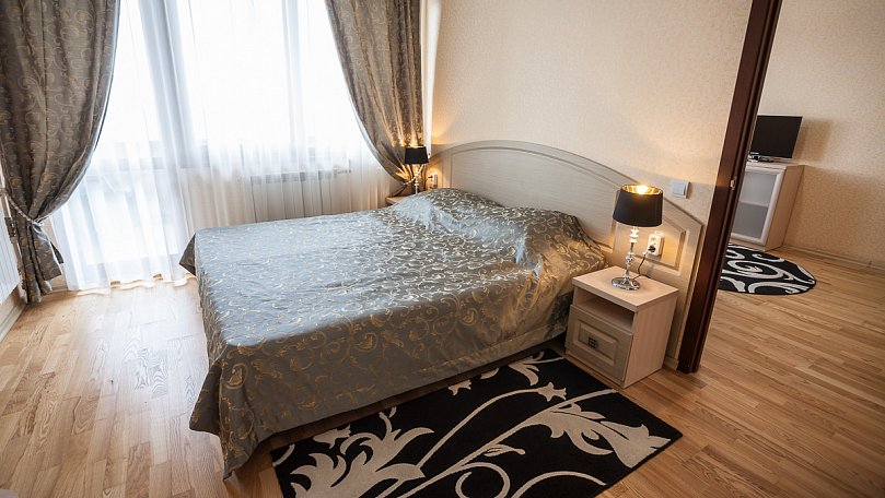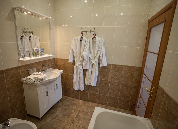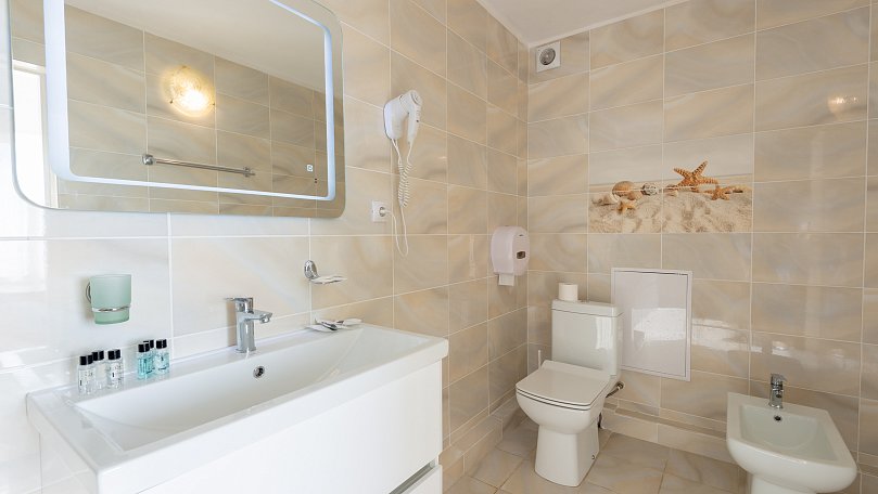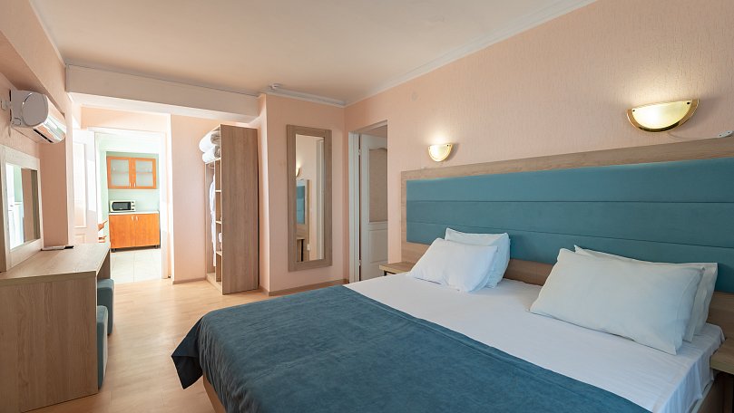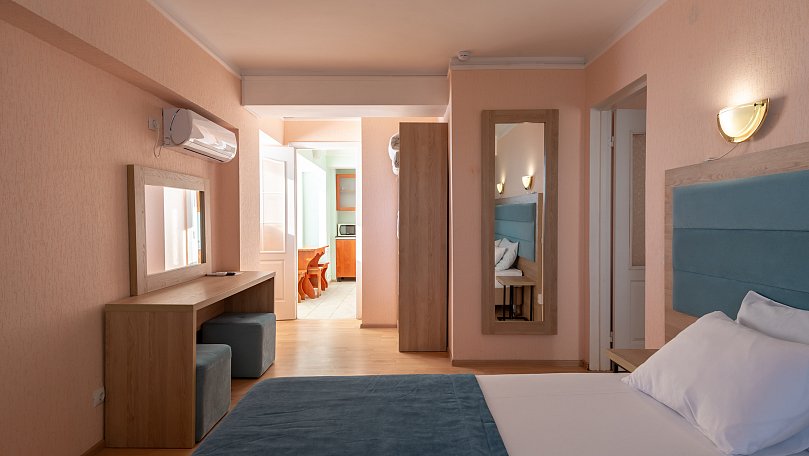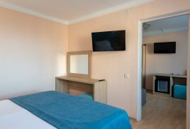 - 2-местный 3-комнатный номер Апартамент. Корпус № 10, 11. Площадь номера 50 кв. м. В номере: спальня с двухспальной кроватью, гостиная с мягкой мебелью, телевизор, кондиционер, кухня (электрический чайник, микроволновая печь, холодильник, набор кухонной посуды), 2 санузла, (биде, ванна или душевая кабина, фен, халаты, тапочки). Корпус № 10 - прямой вид на море и территорию; корпус № 11 - прямой или боковой вид на море и на территорию.