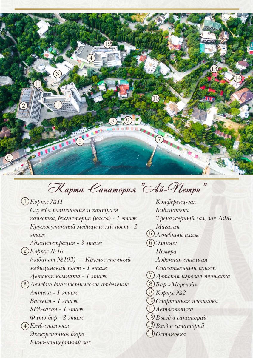 Для гостей санатория работают два комфортабельных корпуса - №10 и №11, расположенные в 50-ти метрах от моря. Все корпуса оснащены лифтами. Отдельно стоит остановиться на здании корпуса №11. В то время как нижние этажи утопают в зелени, великолепный вид на море открывается с балконов верхних этажей корпуса. На территории санатория «Ай-Петри» можно встретить стройные кипарисы и ароматные розовые метелки ленкоранской акации, итальянскую сосну пиния и красивые пестрые цветочные клумбы. Во всю эту красоту органично вписывается и спальный корпус №10.