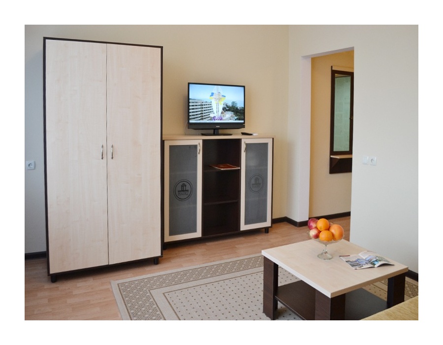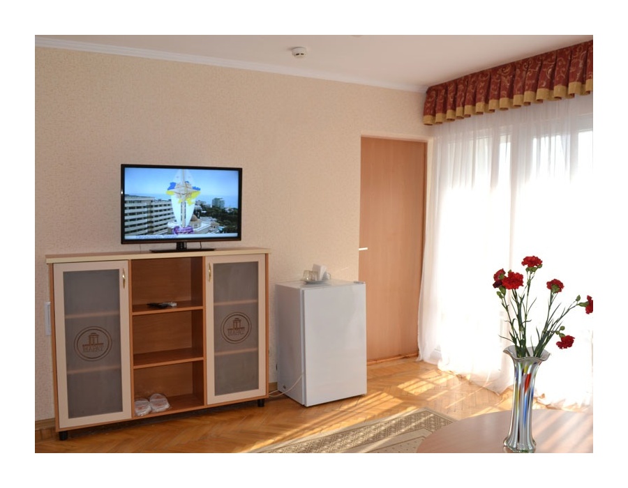 - 2-местный 2-комнатный Полулюкс Комфорт. Площадь - 37 кв.м. В номере: спальная с двуспальной кроватью, гостиная с мягкой мебелью, санузел с душем, телевизор, холодильник, кондиционер, балкон. Вид из номера: на море или горы. Номера расположены на 4-6м, 8-10м этажах.