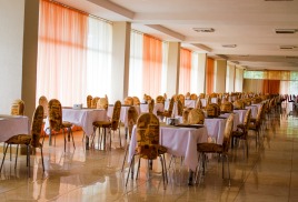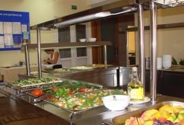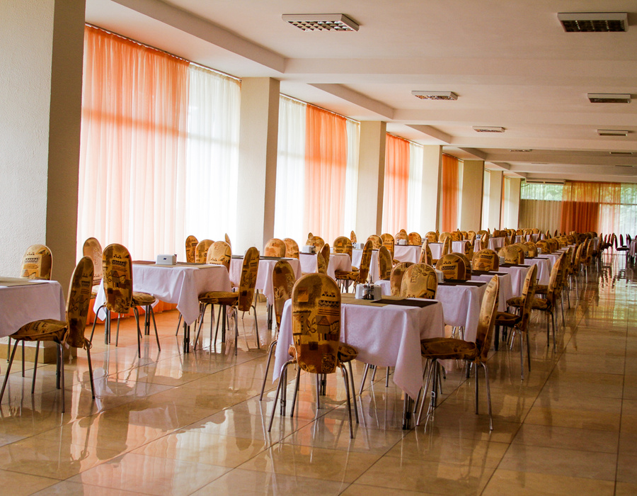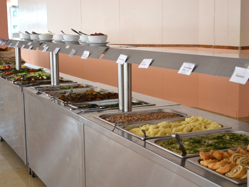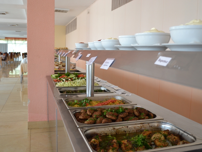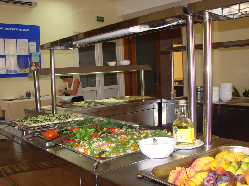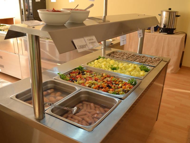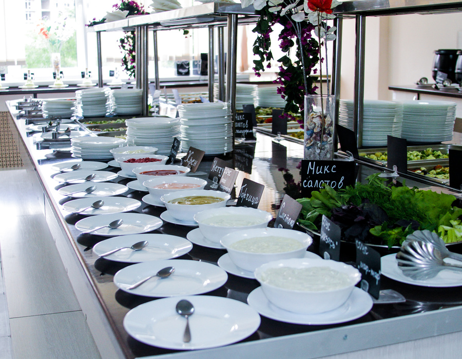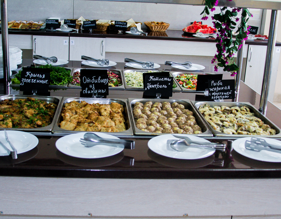 Столовая расположена в отдельно стоящем здании. Общая вместимость зала - до 700 человек. Зал имеет выход на открытую террасу, кондиционирован, для удобства гостей разделен на раздаточную зону «шведской линии» и просторного зала со столиками на 4-х человек.