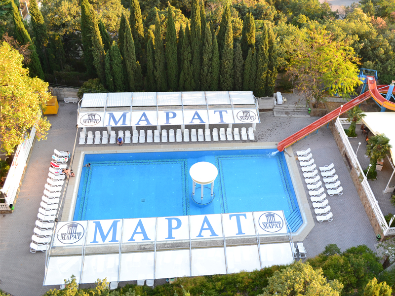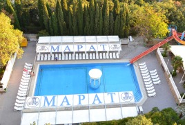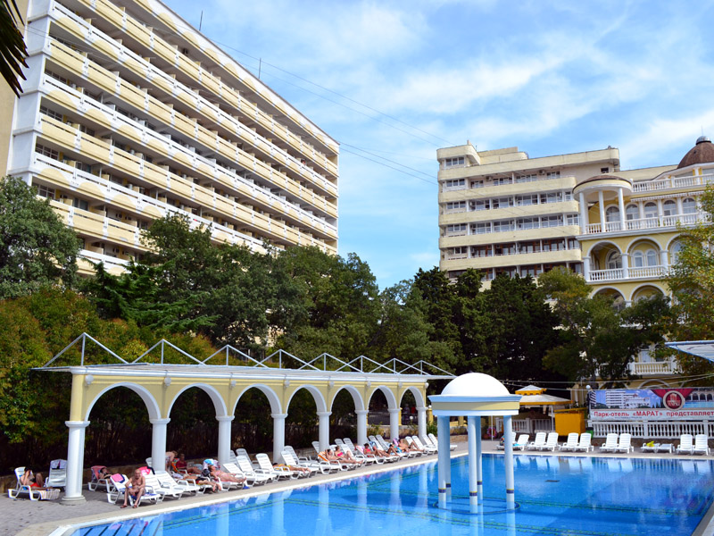 В десяти километрах к западу от Ялты, в одном из самых живописных уголков Южного побережья Крыма – курортном поселке Гаспра – раскинулся Парк-отель «Марат». Его современные десятиэтажные корпуса взметнулись парусами вверх, соперничая с высотою гор, а Вилла «Парк Чаир» - здание в стиле ампир, гармонично вписалась в неповторимый крымский ландшафт, став его неотъемлемой частью. Основная часть территории отеля «Марат», площадь которой целых 7,5 га, – это жилые корпуса и развитая инфраструктура, а еще зеленая зона с растениями, типичными для южного берега Крыма.