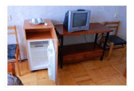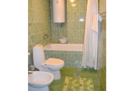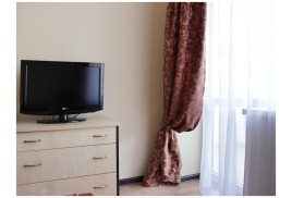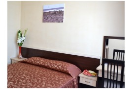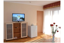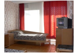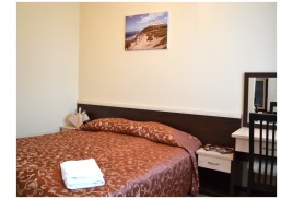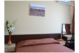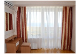 - 2-местный 1-комнатный номер Комфорт. Площадь – 19 кв. м. В номере: двуспальная кровать, санузел с душем, телевизор, холодильник, кондиционер, балкон. Вид из номера: на море или горы.