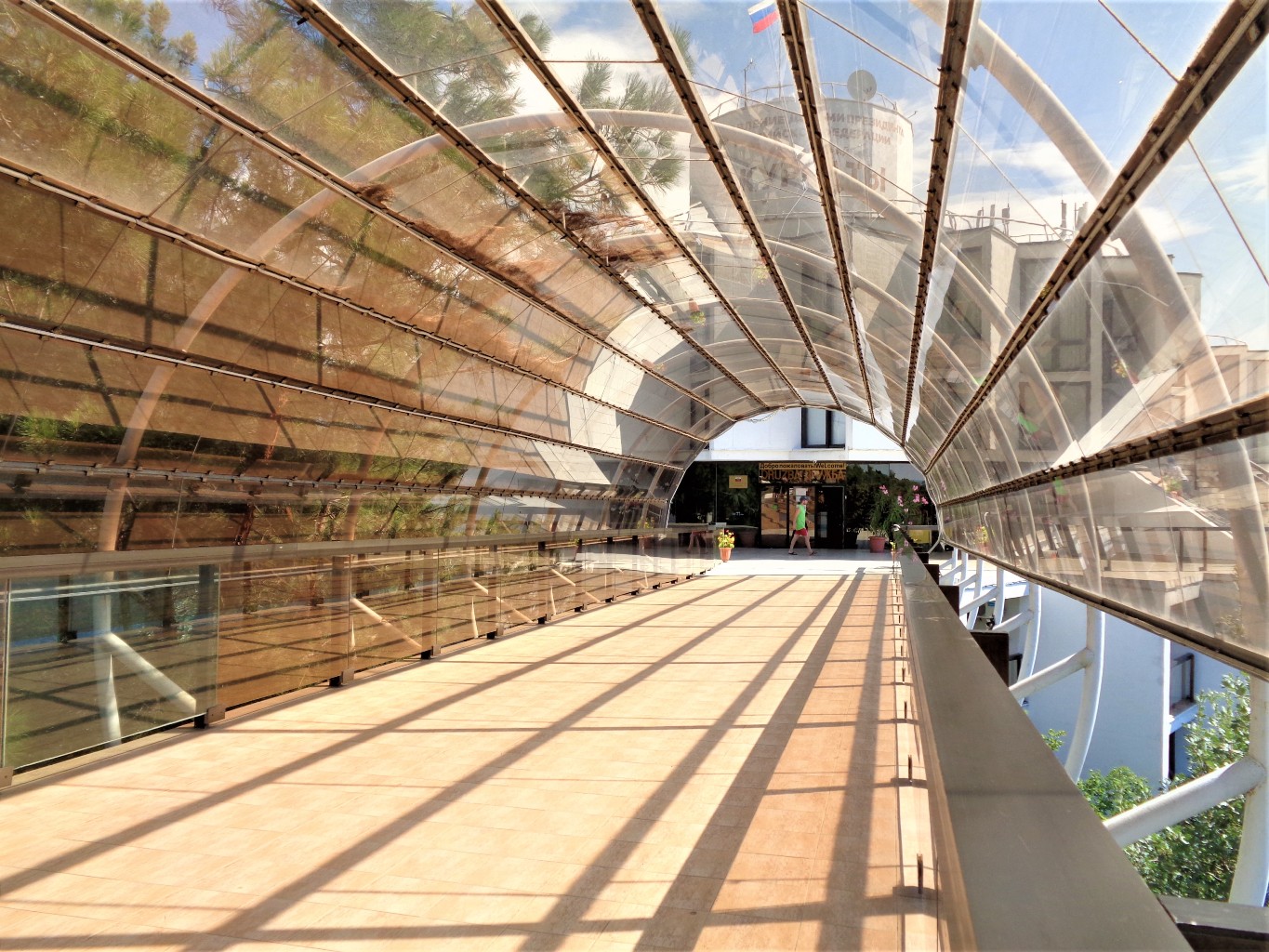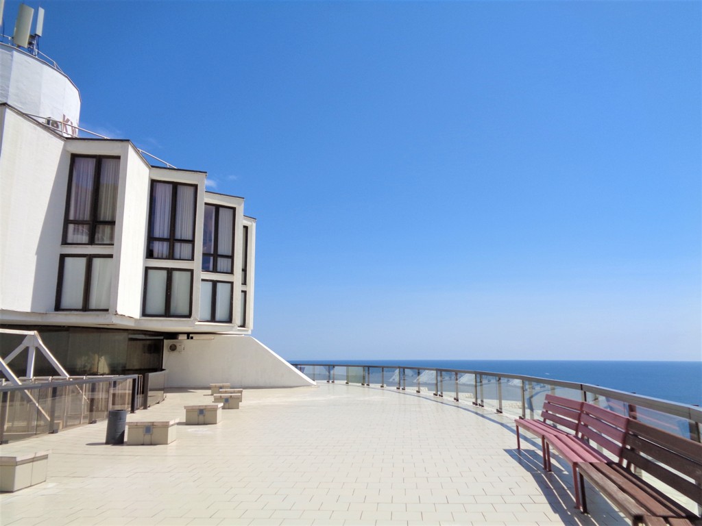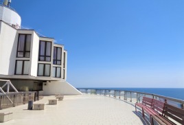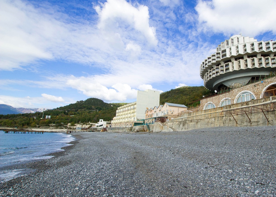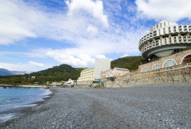 Пляж: собственный галечный, в 50 метрах от корпуса, оборудован душевыми кабинками, медицинским пунктом, лежаками (входят в стоимость) и теневыми навесами. На пляж можно спуститься на лифте из корпуса или по лестнице. На пляже работает бар и кафе.