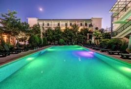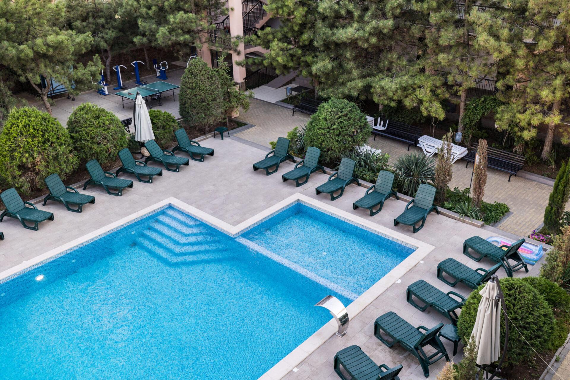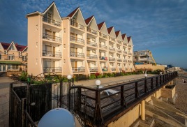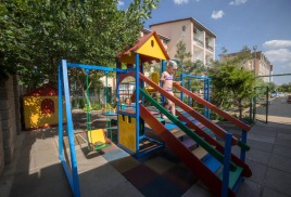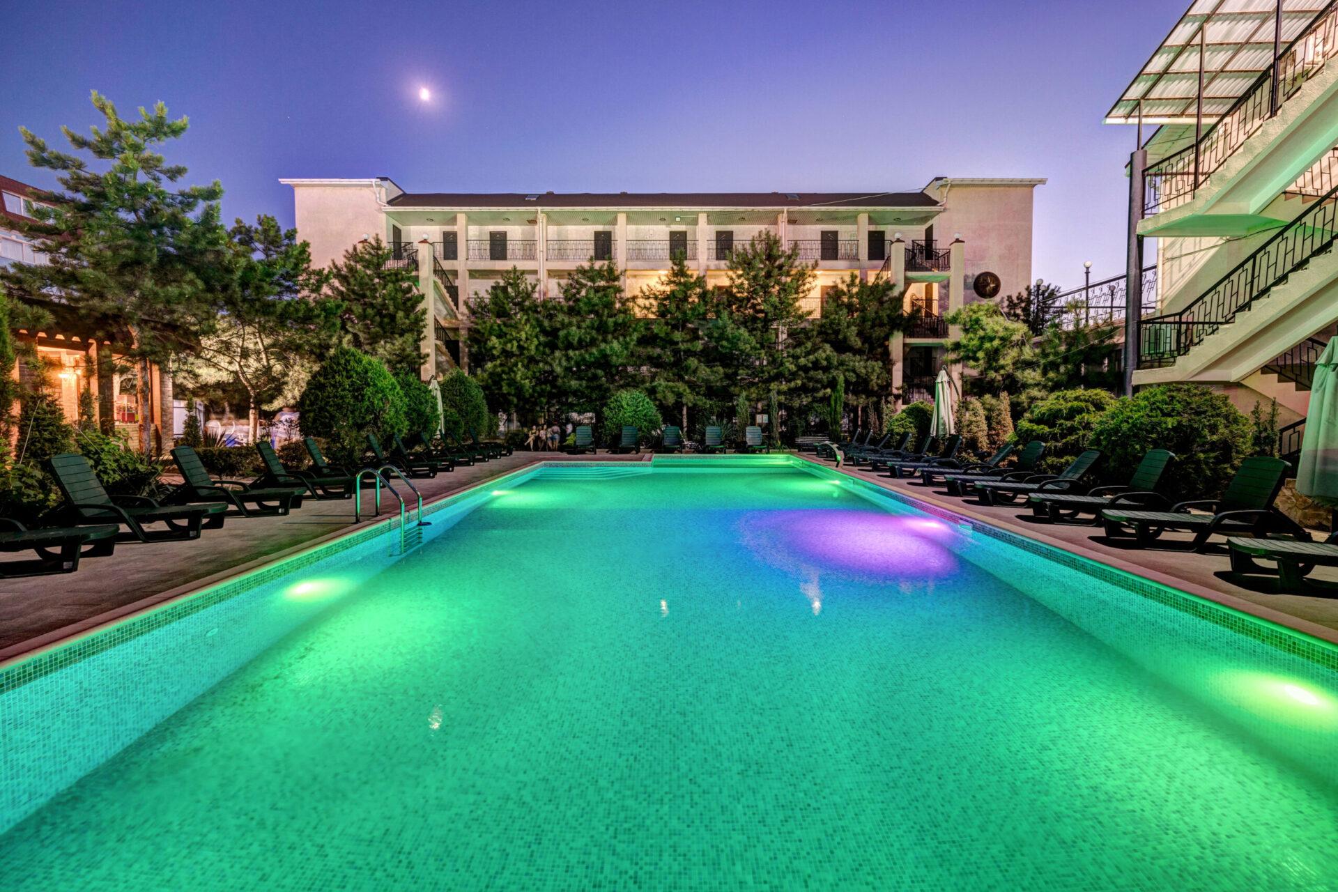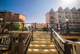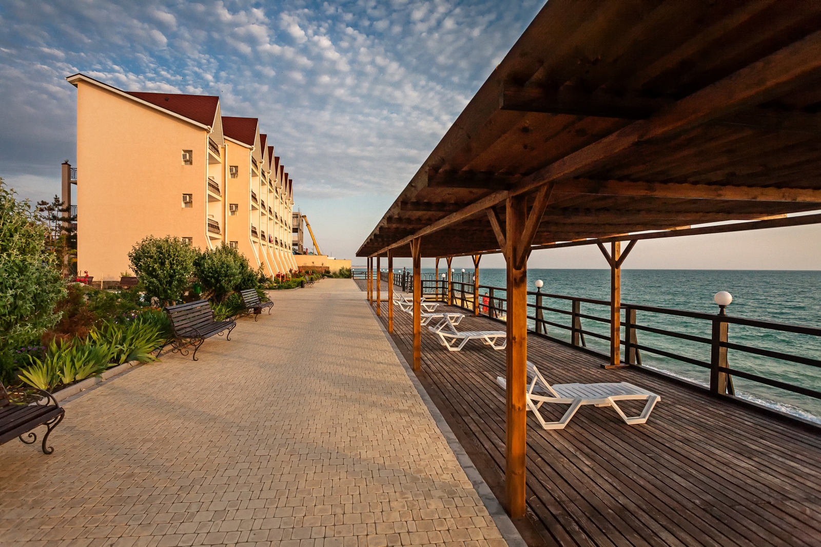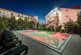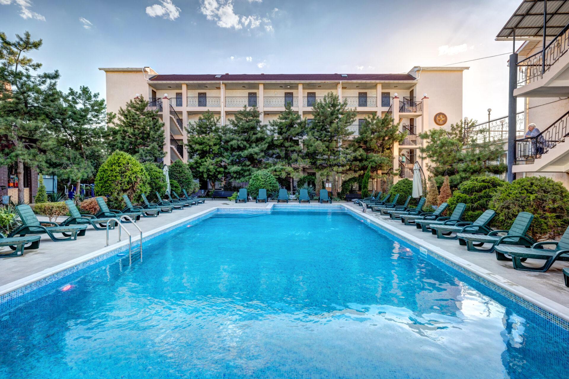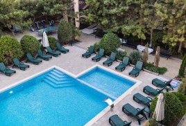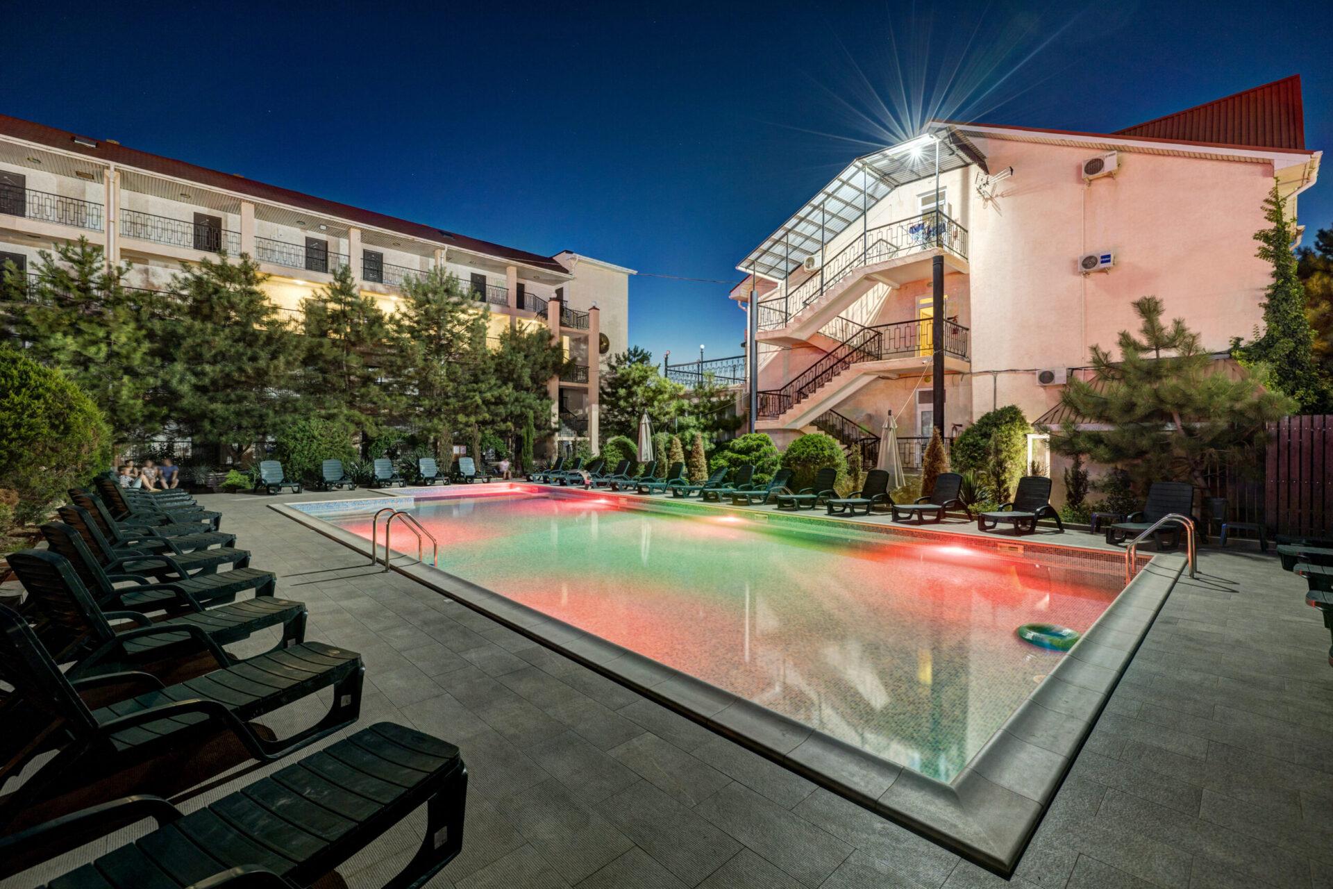 Пляж: песчано-галечный, поселковый в 30 метрах от корпусов, прокат шезлонгов за дополнительную плату. Есть бар, кабинки для переодевания, навесы, водные развлечения.