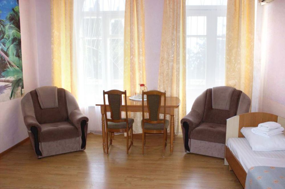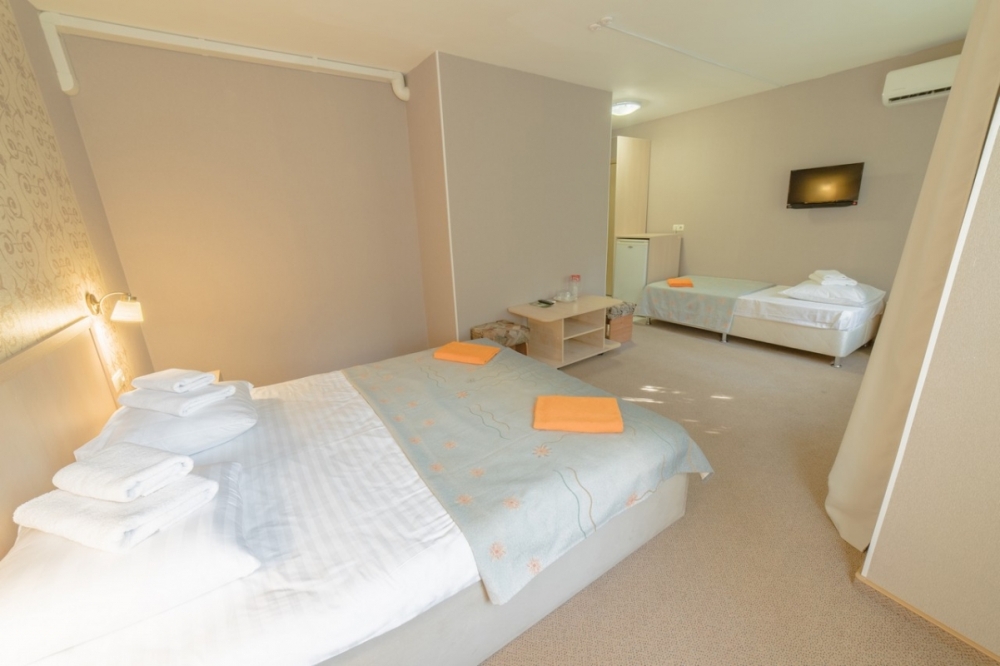 - 3-местный 2-комнатный эконом. (1 номер) Площадь 35 кв.м. В номере: спальня с двуспальной кроватью, гостиная с односпальной кроватью, телевизор, холодильник, кондиционер, санузел с душем. Дополнительное место - раскладушка. Номера имеют отдельных вход.
