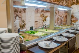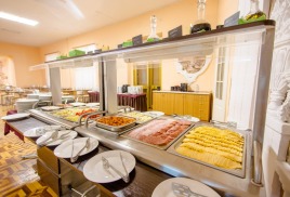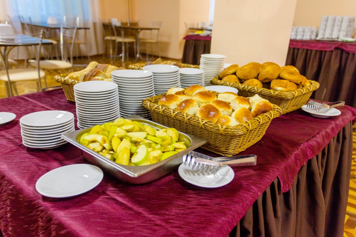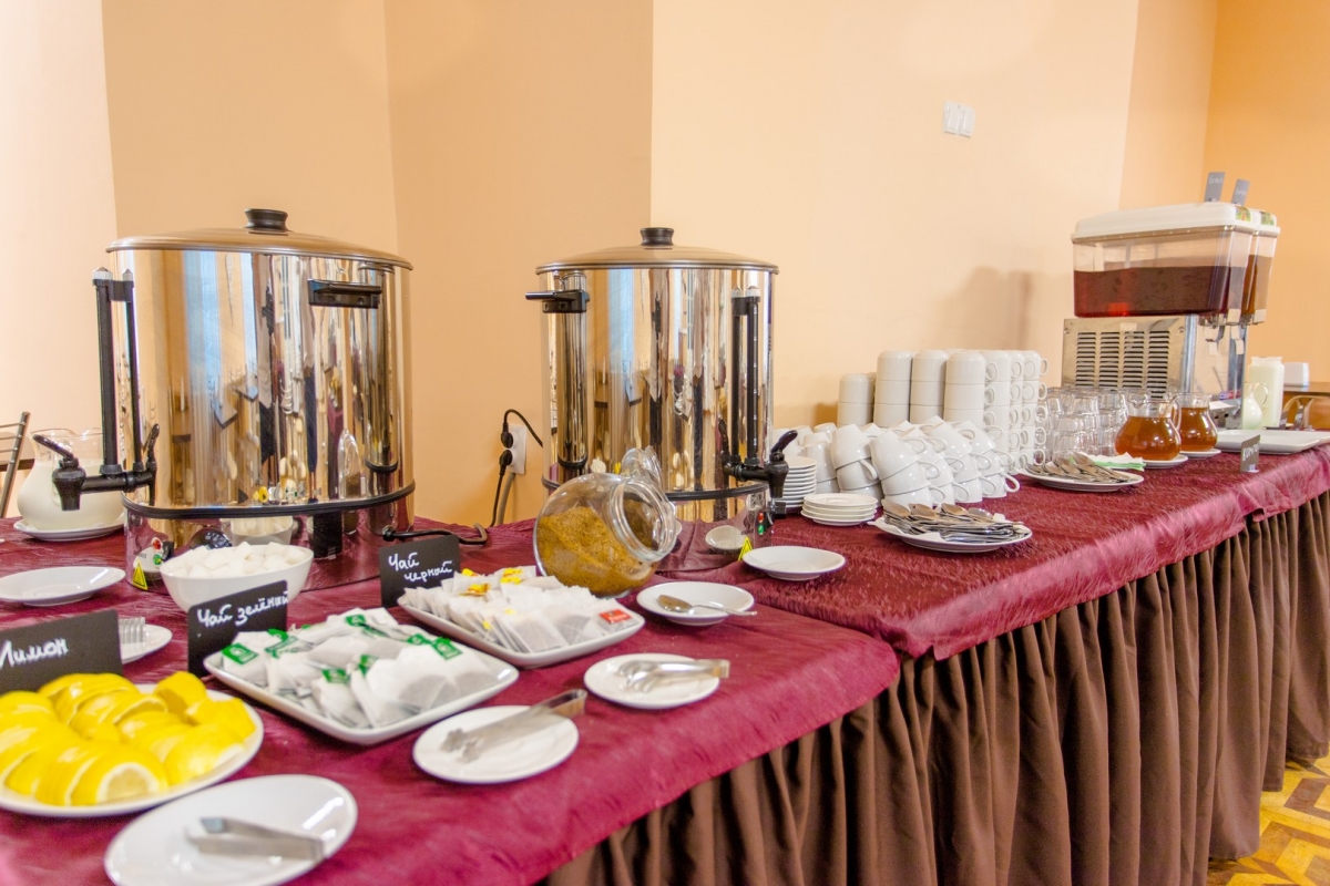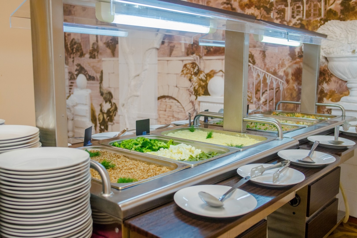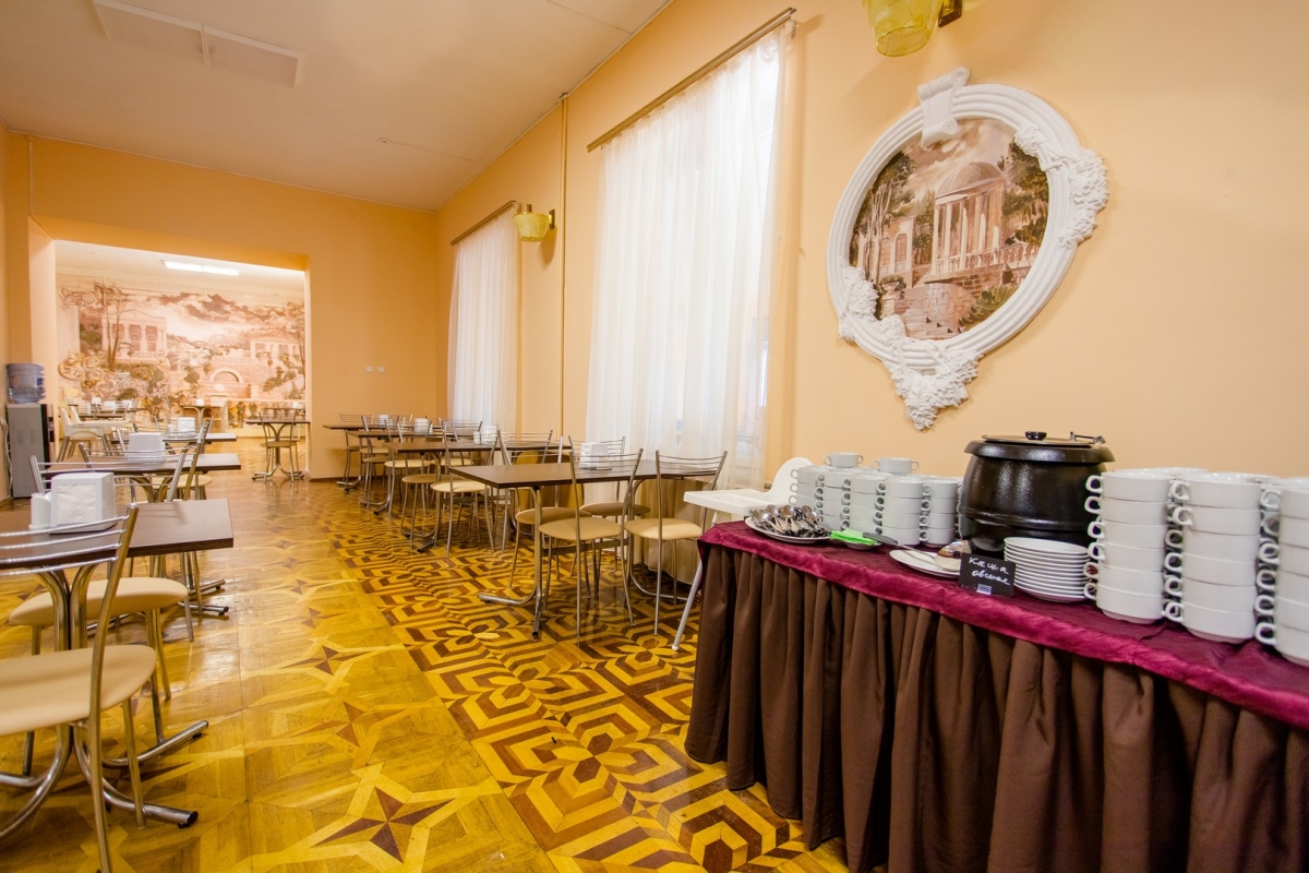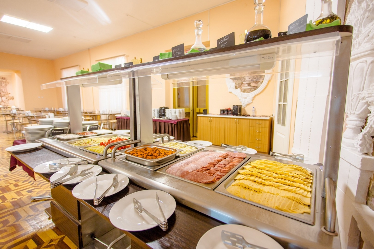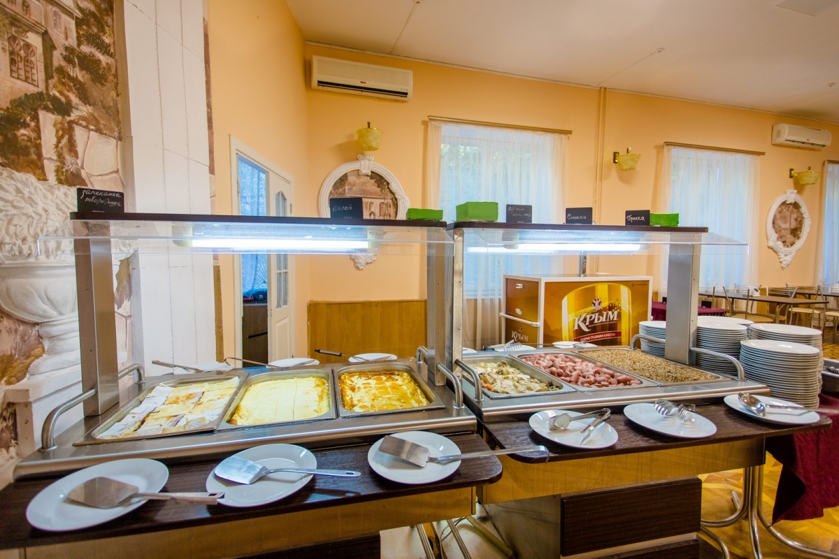 - В кафе «Раевский» представлено питание по системе «шведский стол»: здесь гости найдут большой выбор блюд от шеф-повара: салаты, горячие и холодные закуски, первые и вторые блюда, кондитерские изделия и фрукты; безалкогольные и алкогольные напитки: компот, морс, чай и кофе, красное и белое вино, игристый напиток и пиво. Для маленьких гостей - диетические блюда, молочные каши, бульоны, молоко, йогурты, сухие завтраки.